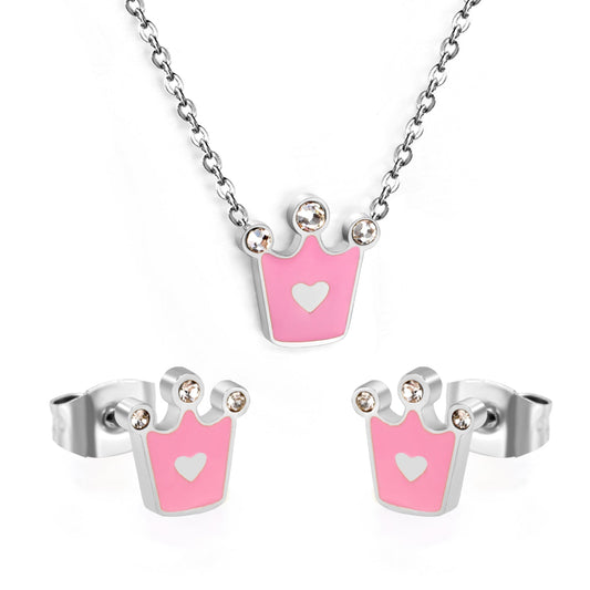 8*8.4mm Crown with Pink Oil Drip Earrings + 11.7*12mm Pendant Necklace Set Cross 0.35 45+5cm+6mm Round Tail Plaque Set Steel Color / Gold