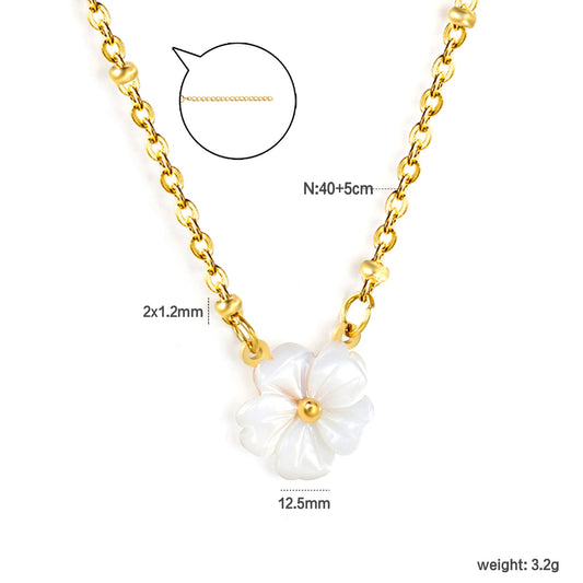 12.5mm white shell peach blossom flower clasp bead chain 40+5cm+6mm round pendant necklace, gold