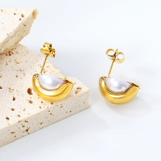 6*14mm semi-curved hoop with 10mm semi-white rubber bead earrings Gold color