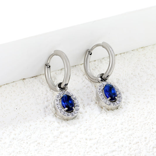 Wire 2*14mm O.D. earrings + 8.4*10.2mm oval blue glass + CNC drilling white zirconium hoop fittings earrings steel color