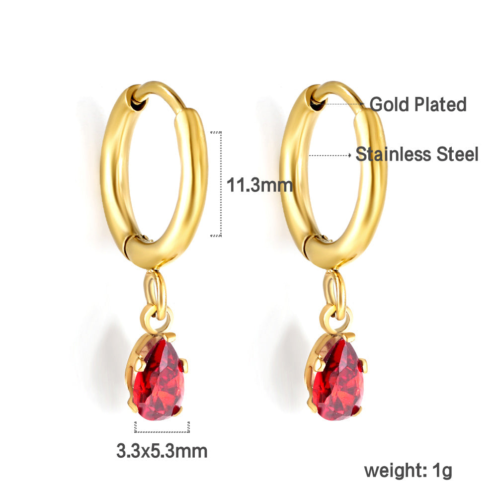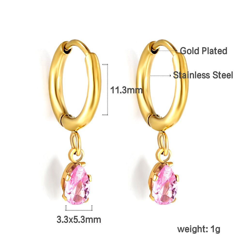 These earrings feature 1.5x8mm I.D. hoops and 3.6*5mm zirconium drops in various colors. Perfect for adding a touch of elegance to any outfit. Made with gold/steel color and hypoallergenic materials. Comfortable to wear all day long.