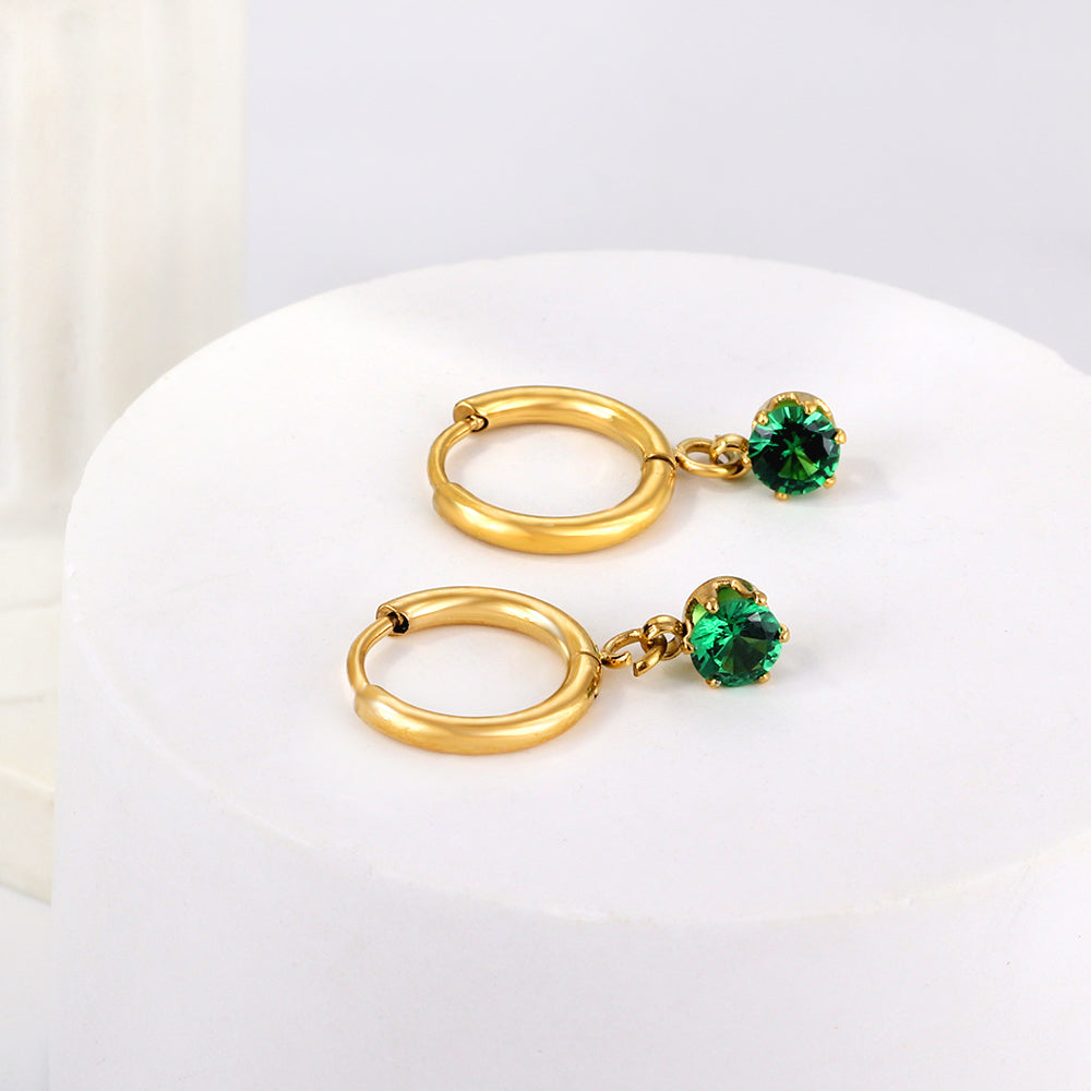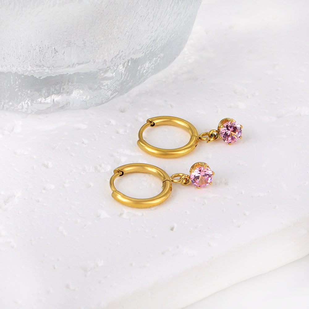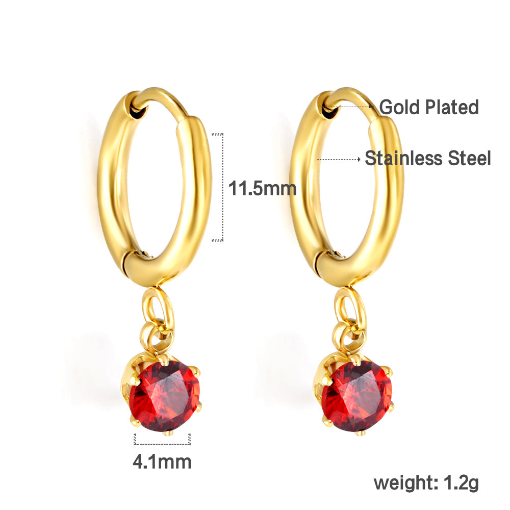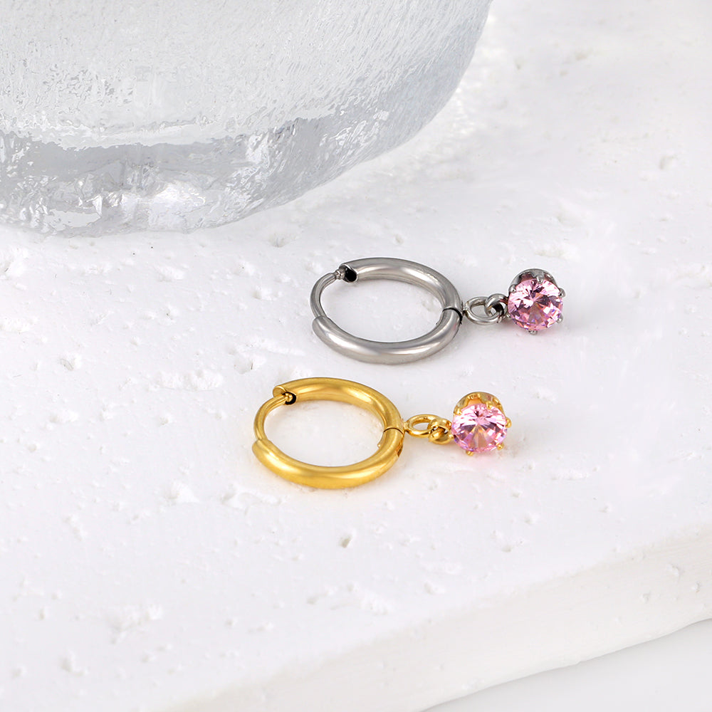 These earrings feature a 1.5x8mm I.D. design with 4.5mm white/purple/red/pink/green zirconium round-shaped fittings in a classic steel color. Made with expert precision, they offer comfortable wear and a unique touch to any outfit. Perfect for those seeking a sophisticated and timeless look.