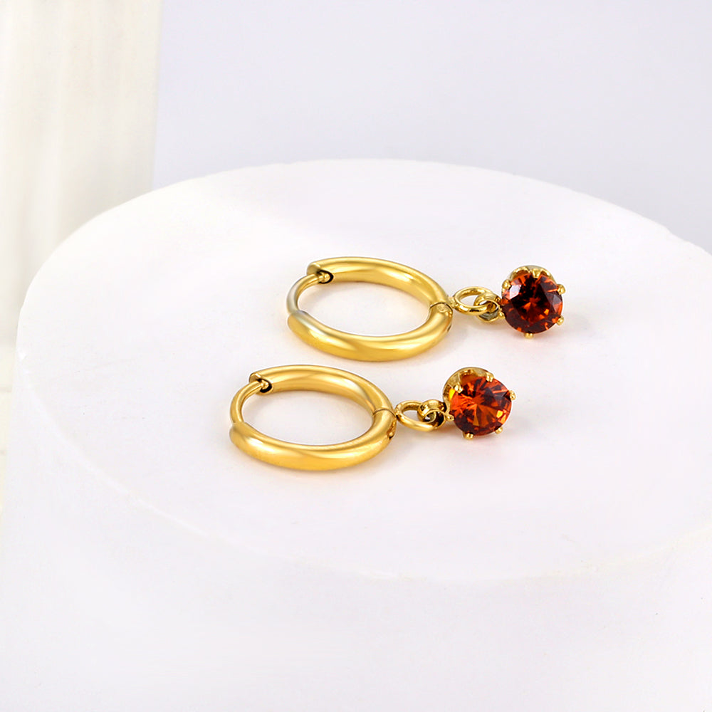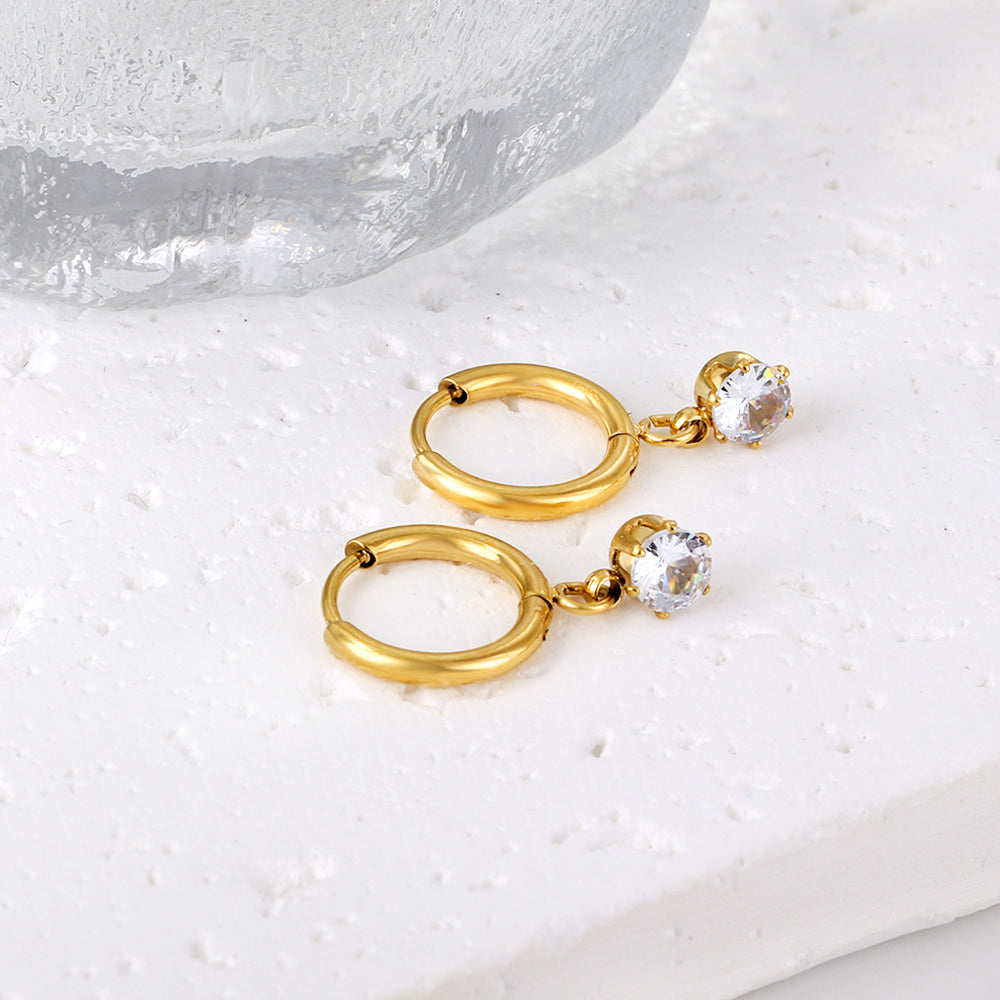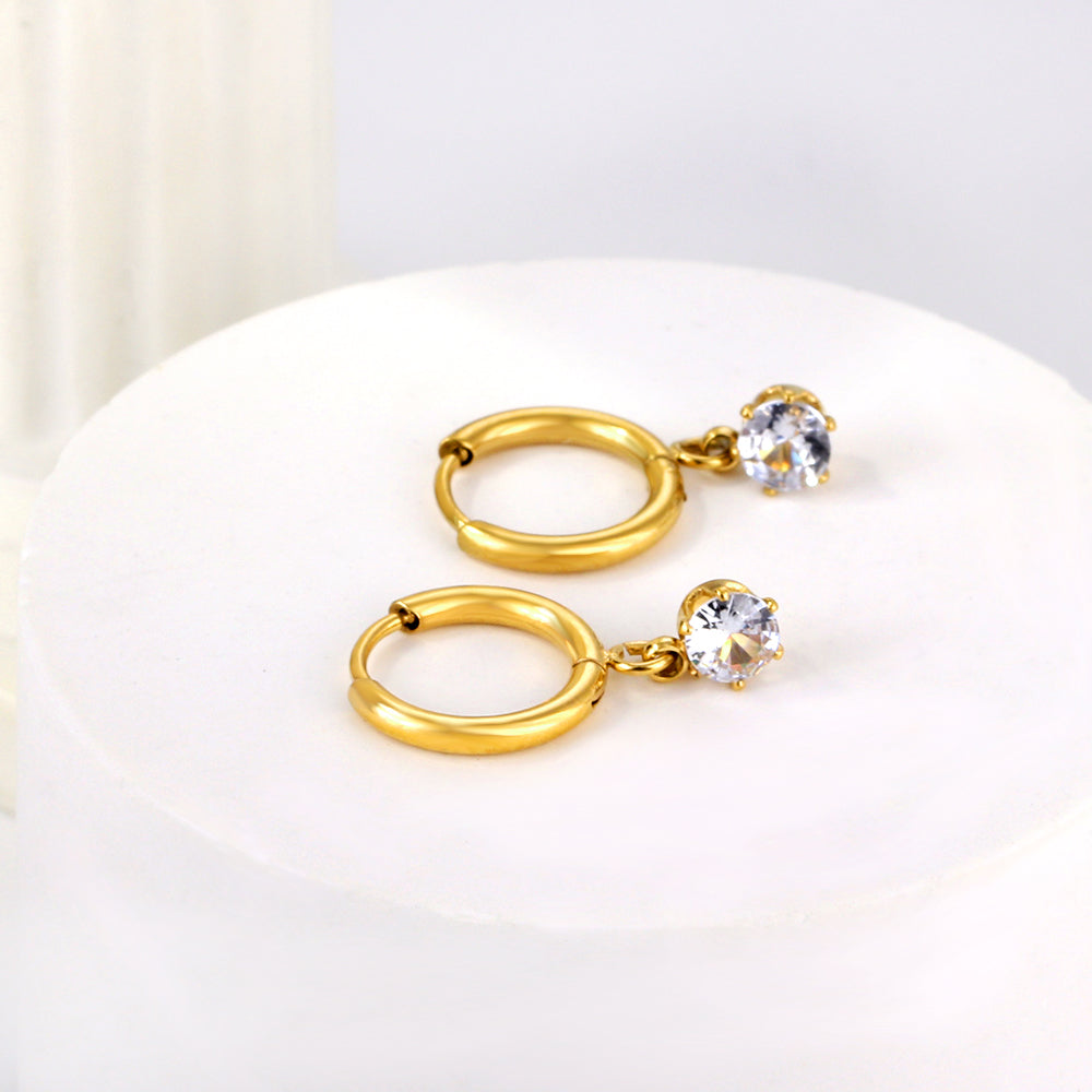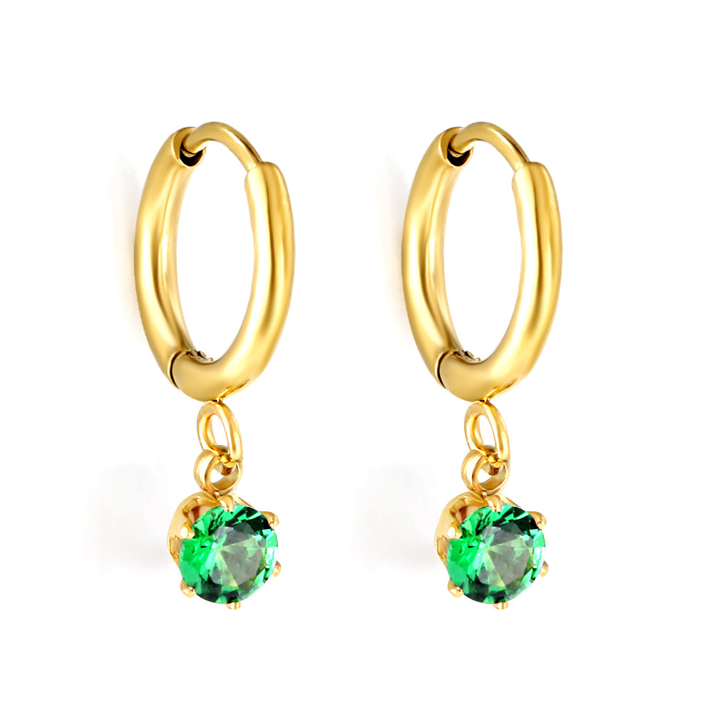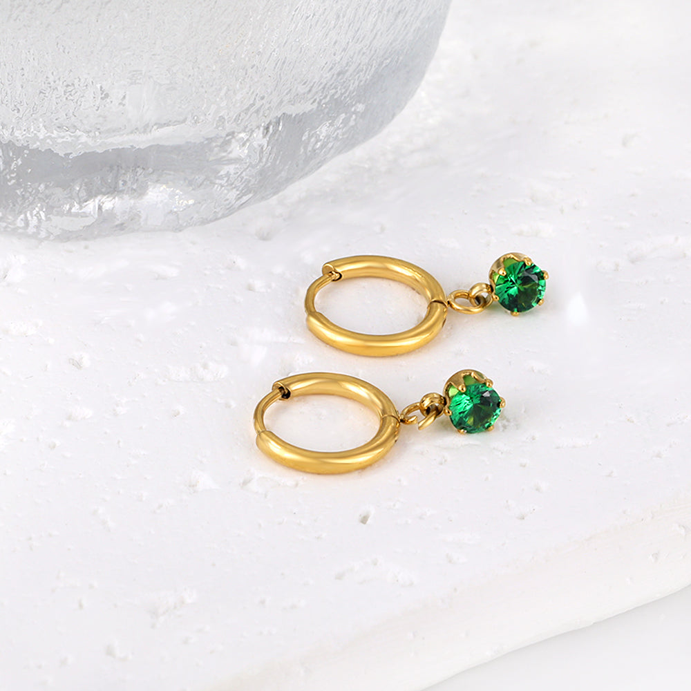 These earrings feature a 1.5x8mm I.D. design with 4.5mm white/purple/red/pink/green zirconium round-shaped fittings in a classic steel color. Made with expert precision, they offer comfortable wear and a unique touch to any outfit. Perfect for those seeking a sophisticated and timeless look.