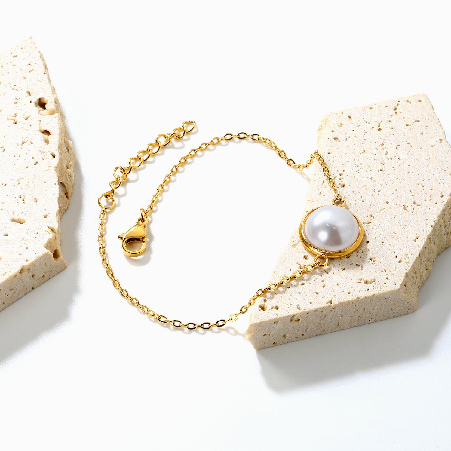 This bracelet features round beads measuring 12 to 14mm, accented with half white pearls for a subtle, elegant contrast. Adjustable from 16 to 18cm with a 3cm extension, it ensures a comfortable fit. Available in steel and gold color options, this piece combines classic sophistication with versatile wearability, crafted for enduring style and grace.