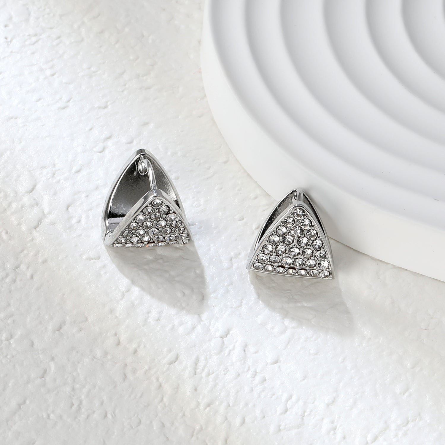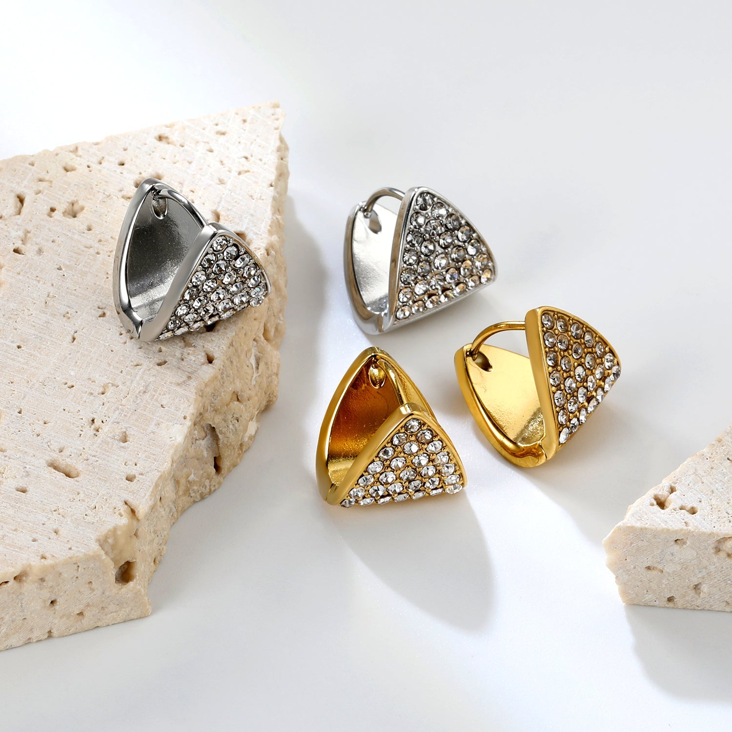 Distinctive 12.8*13.2mm triangular earrings featuring an innovative dumpling-inspired contour adorned with brilliant white diamond-like accents. Available in both contemporary steel and luxurious gold finishes, these earrings combine geometric precision with dimensional texture for a sophisticated modern aesthetic. The carefully calibrated proportions ensure optimal visual impact while maintaining comfortable wearability. The strategic placement of the white stones enhances the unique triangular silhouette, creating exceptional light reflection from multiple angles for subtle yet noticeable brilliance.