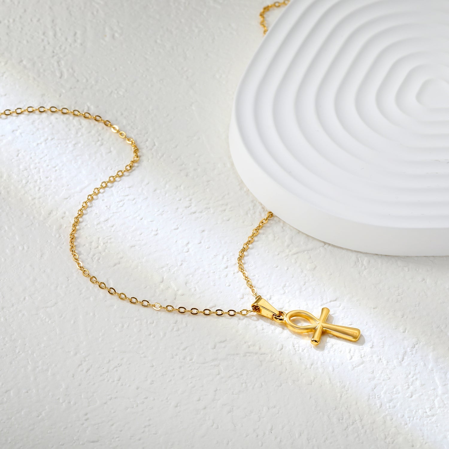 Exquisite 13.1*23mm Egyptian cross pendant showcasing authentic hieroglyphic-inspired design elements. Suspended from a refined 0.4mm cross chain measuring 40cm with a 6cm extension for versatile wear. The lustrous gold finish enhances the pendant's intricate detailing, creating a statement piece that balances historical significance with contemporary elegance.