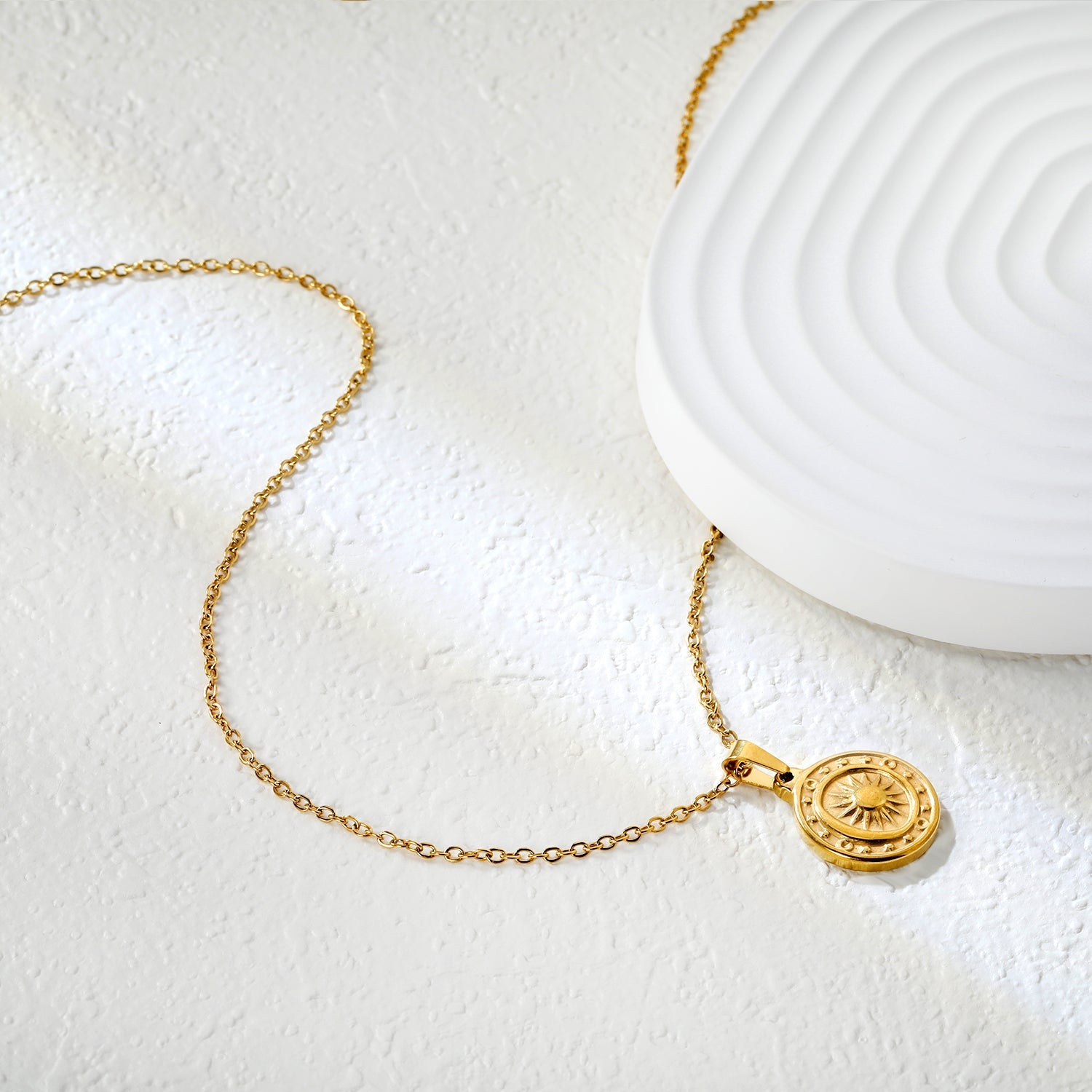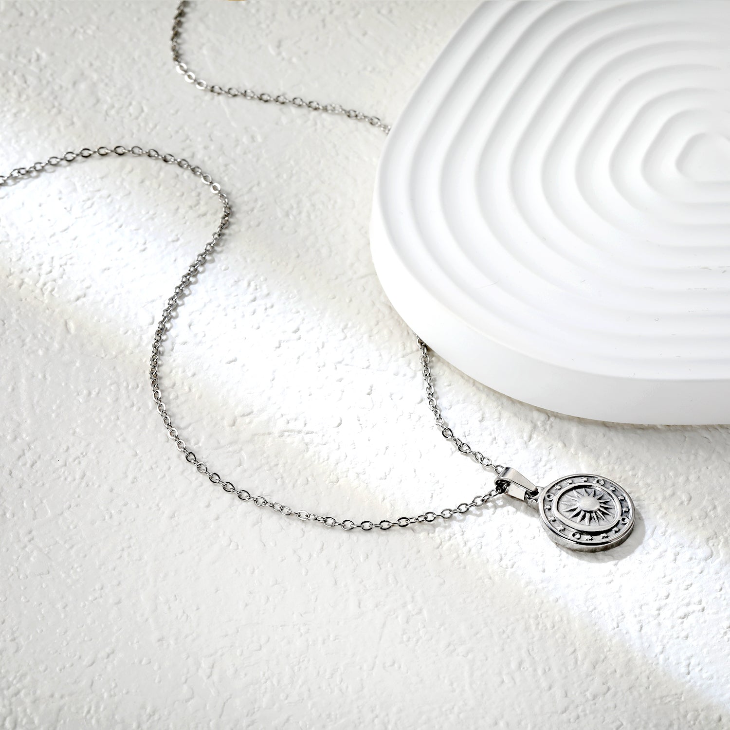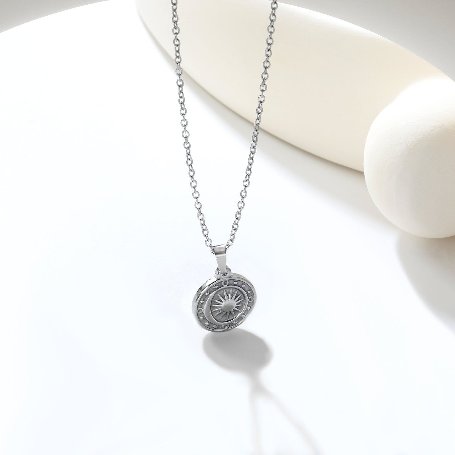 Precision-crafted 15.4mm pendant integrating celestial motifs of sun, moon, star, and compass in a harmonious composition. The intricate detailing showcases exceptional metalwork with dimensional depth. Suspended from a 45cm chain with 5cm extension and 6mm elements for structural integrity. The dual-tone steel/golden finish enhances the astronomical symbolism while providing sophisticated contrast. This meticulously balanced piece offers both directional significance and aesthetic refinement for the discerning wearer.