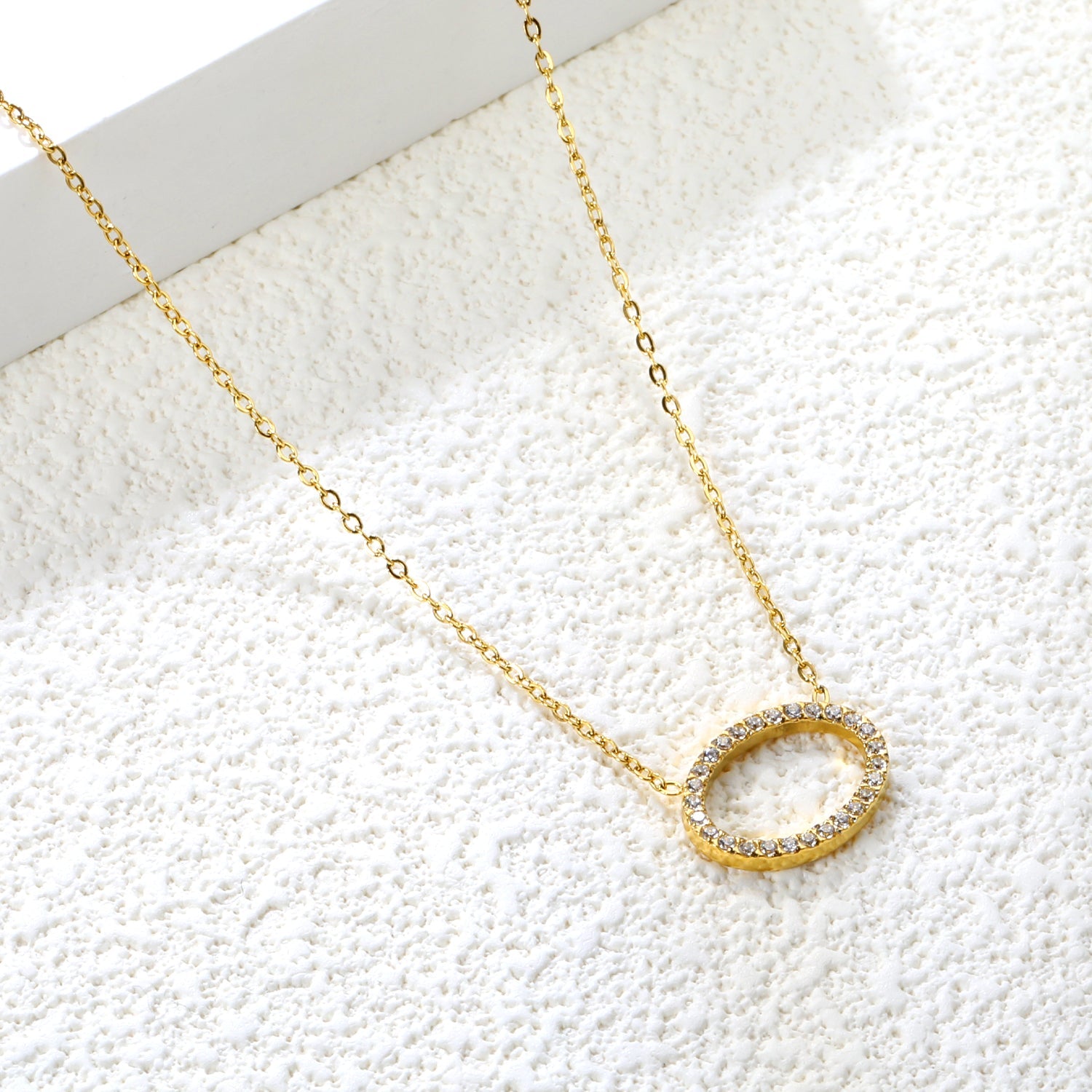 This gold necklace features a 15 x 11.2mm oval CNC-cut white zirconia pendant, suspended from a 0.3mm cross chain measuring 43cm with a 5cm extension for adjustable length. A 6mm round tag adds a subtle finishing detail. Combining precision craftsmanship with elegant design, this piece offers a refined sparkle suitable for both everyday wear and special occasions.