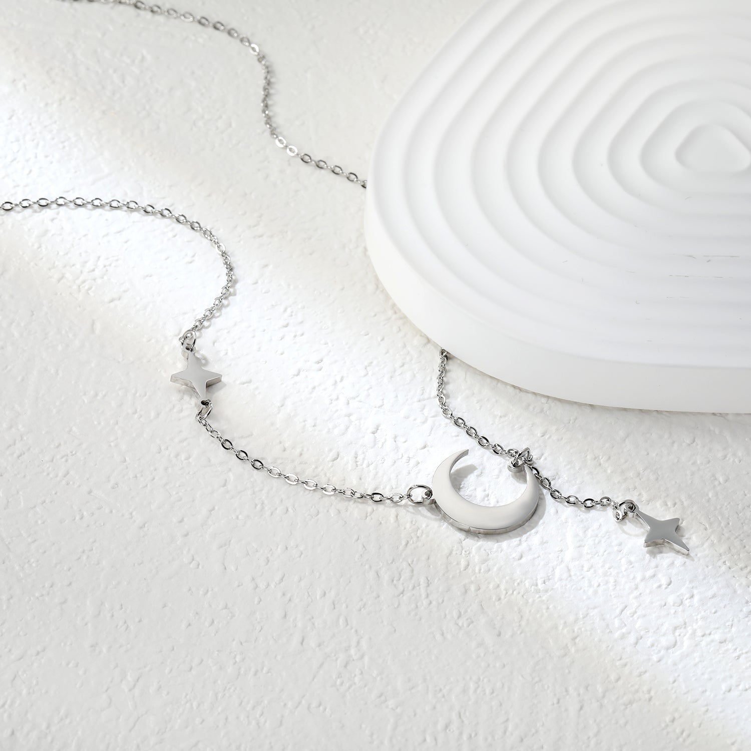 Precision-crafted celestial necklace featuring an 18.4*17mm crescent moon pendant paired with an 8.4*13.3mm star charm. The 4cm tassel adds dynamic movement to this astronomically-inspired piece. Set on a 42cm chain with 5cm extension for adjustable wear, the dual-tone steel/golden finish creates subtle contrast that enhances the dimensional quality. This meticulously balanced composition offers sophisticated whimsy with contemporary appeal.