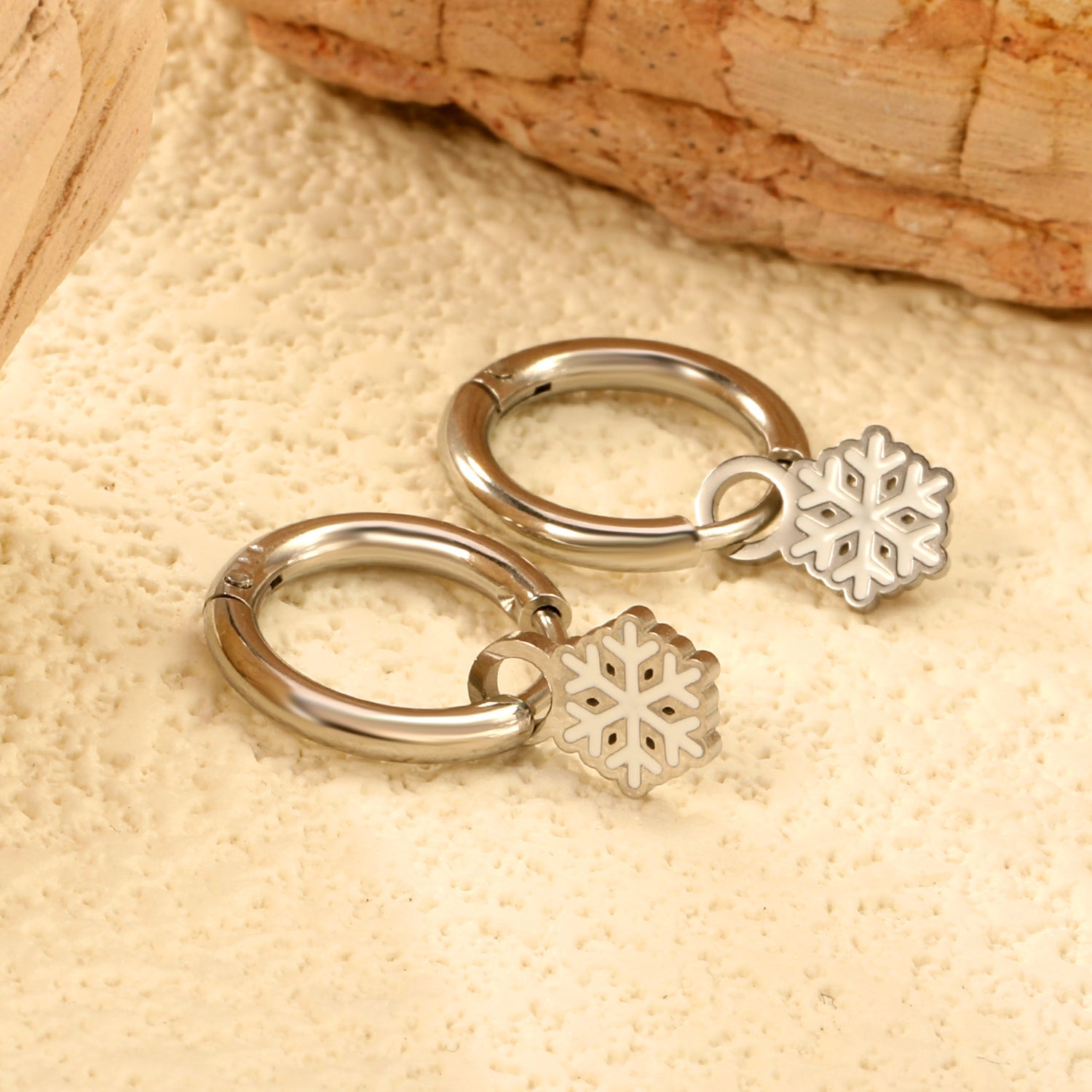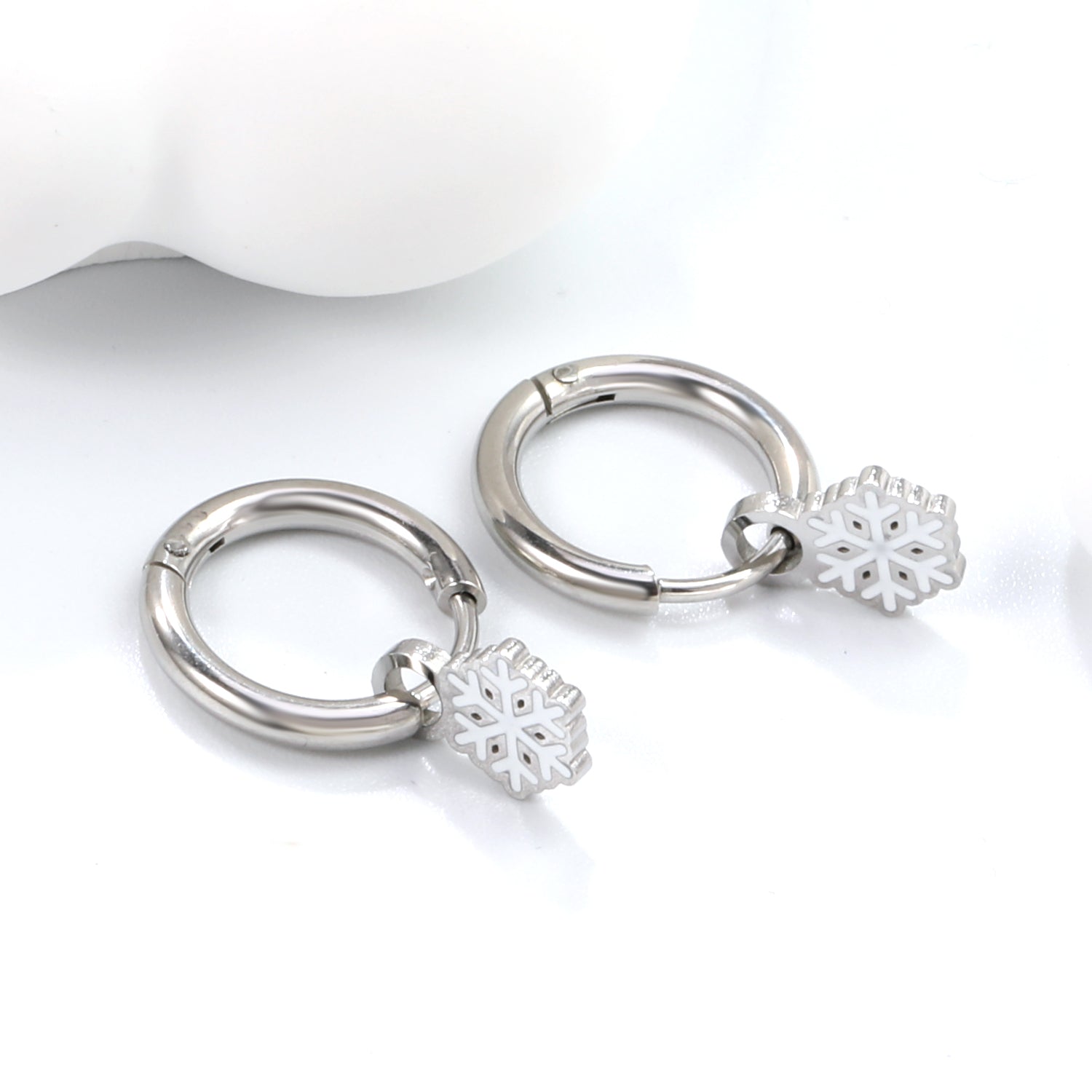 Expertly crafted with precision, these 2*10mm circle + 7*9.5mm snowflake earrings feature a stunning combination of white oil drops in steel or golden color. Designed for versatile wear, these earrings add a touch of elegance and charm to any outfit. Elevate your style with these unique and sophisticated earrings.