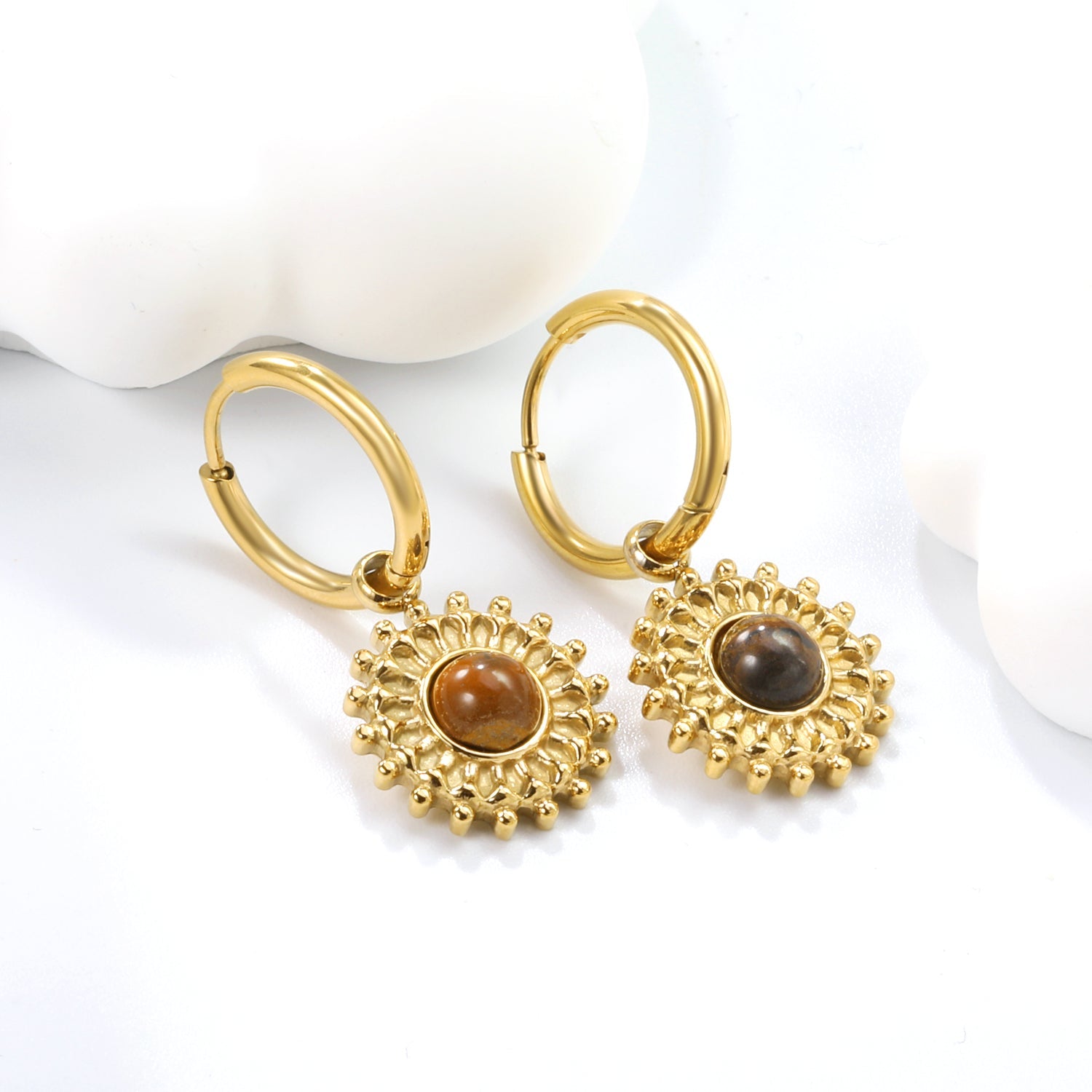 These 2*12mm I.D. earrings feature a 15.2mm round pattern face with gold color fittings. Choose from imitation white pearl, pink crystal, or tiger's eye stone to add a touch of elegance to any outfit.