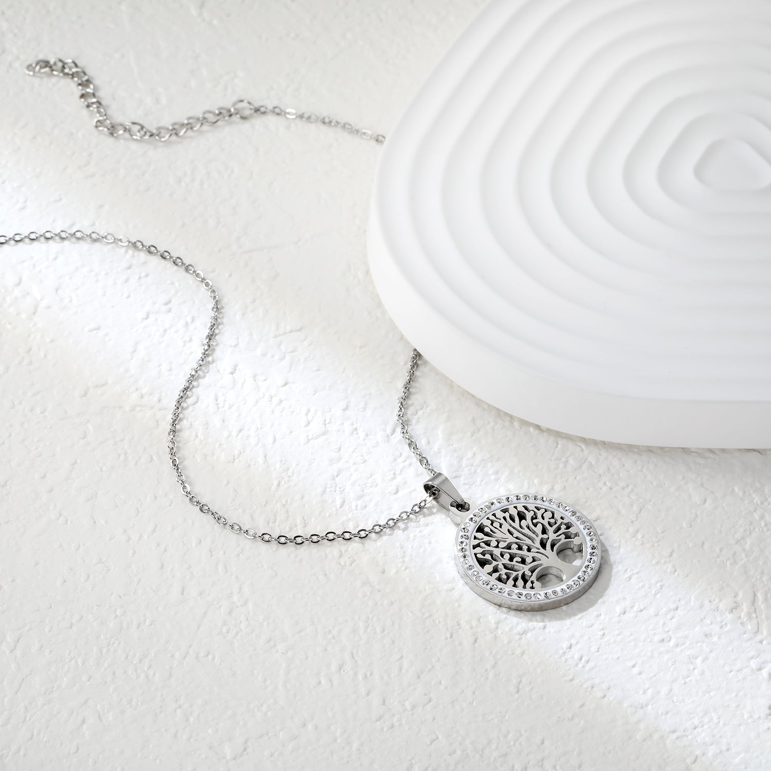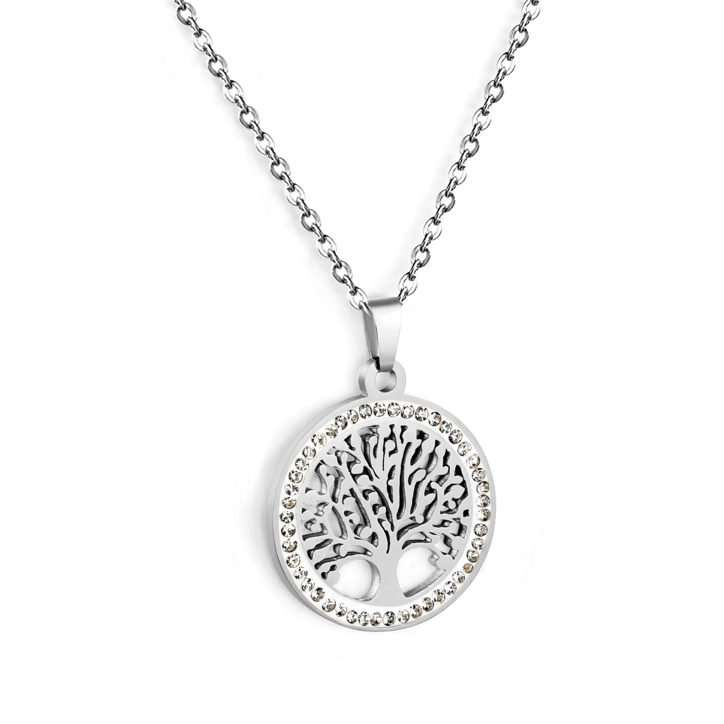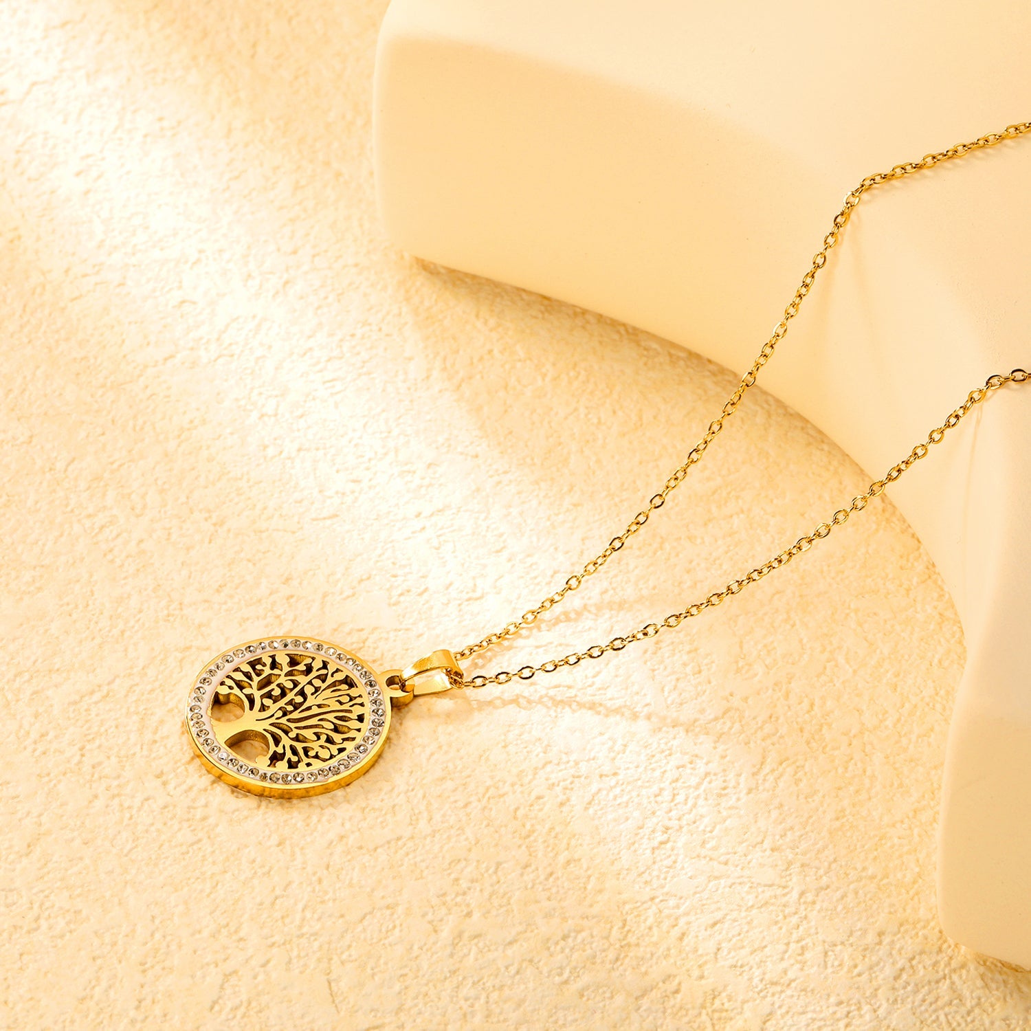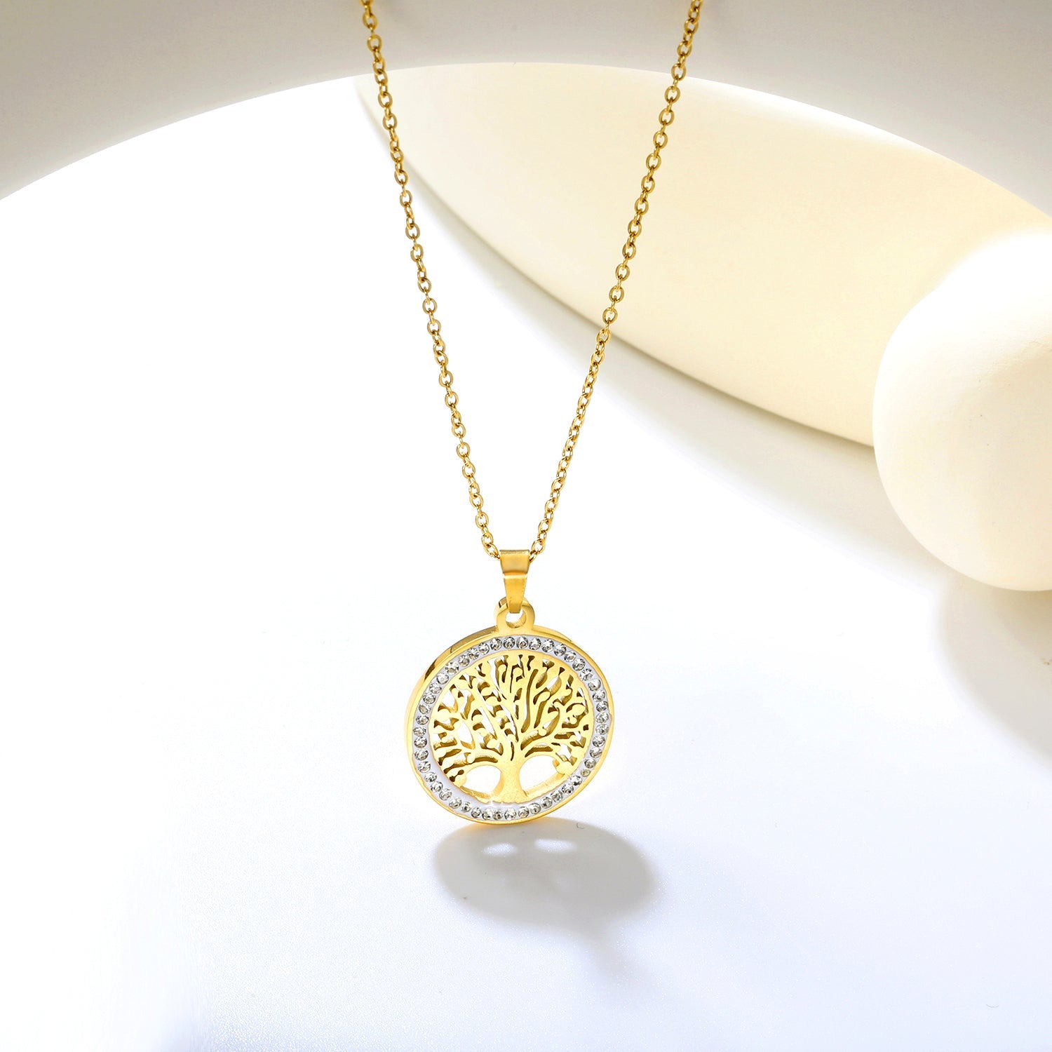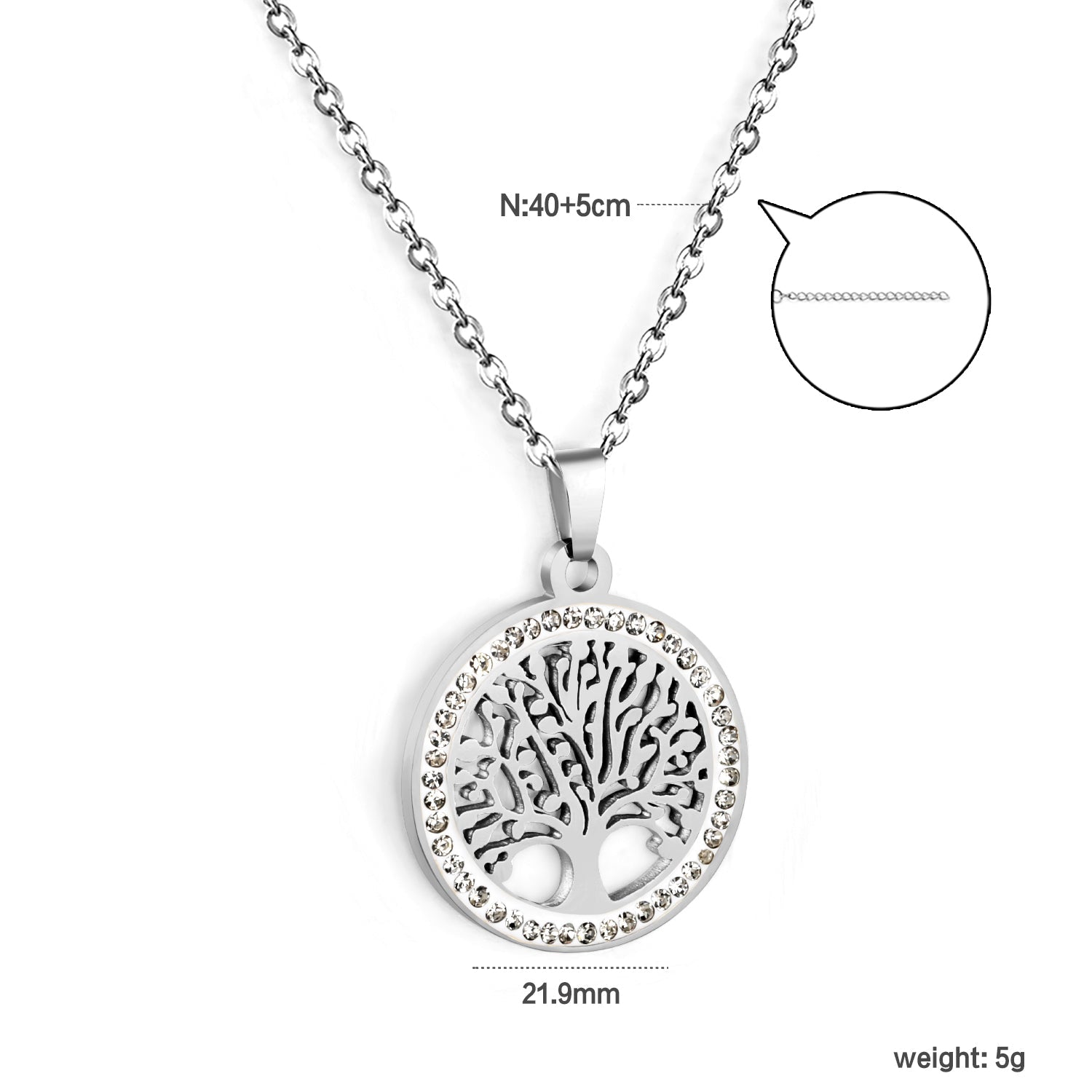 21.9mm Round Hollowed Out Tree of Life with White Diamonds Pendant 40+5cm Necklace Steel/Golden
