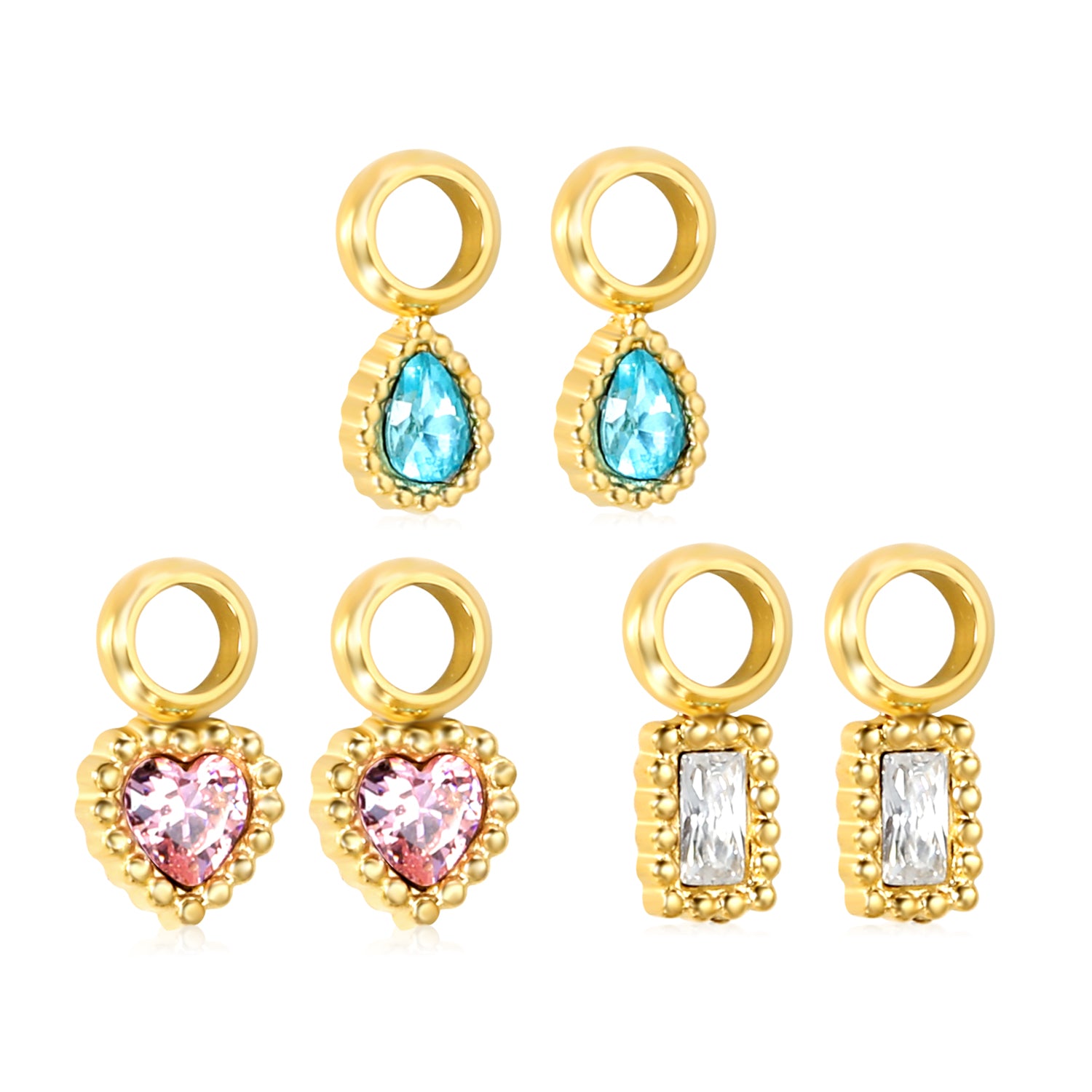3.5*4.5mm beaded teardrop with blue zirconium/5*4.8mm beaded heart with pink zirconium/3.3*4.7mm beaded rectangle with white zirconium fittings+welded 4mm circle Three pairs of mixed fittings set Gold Color