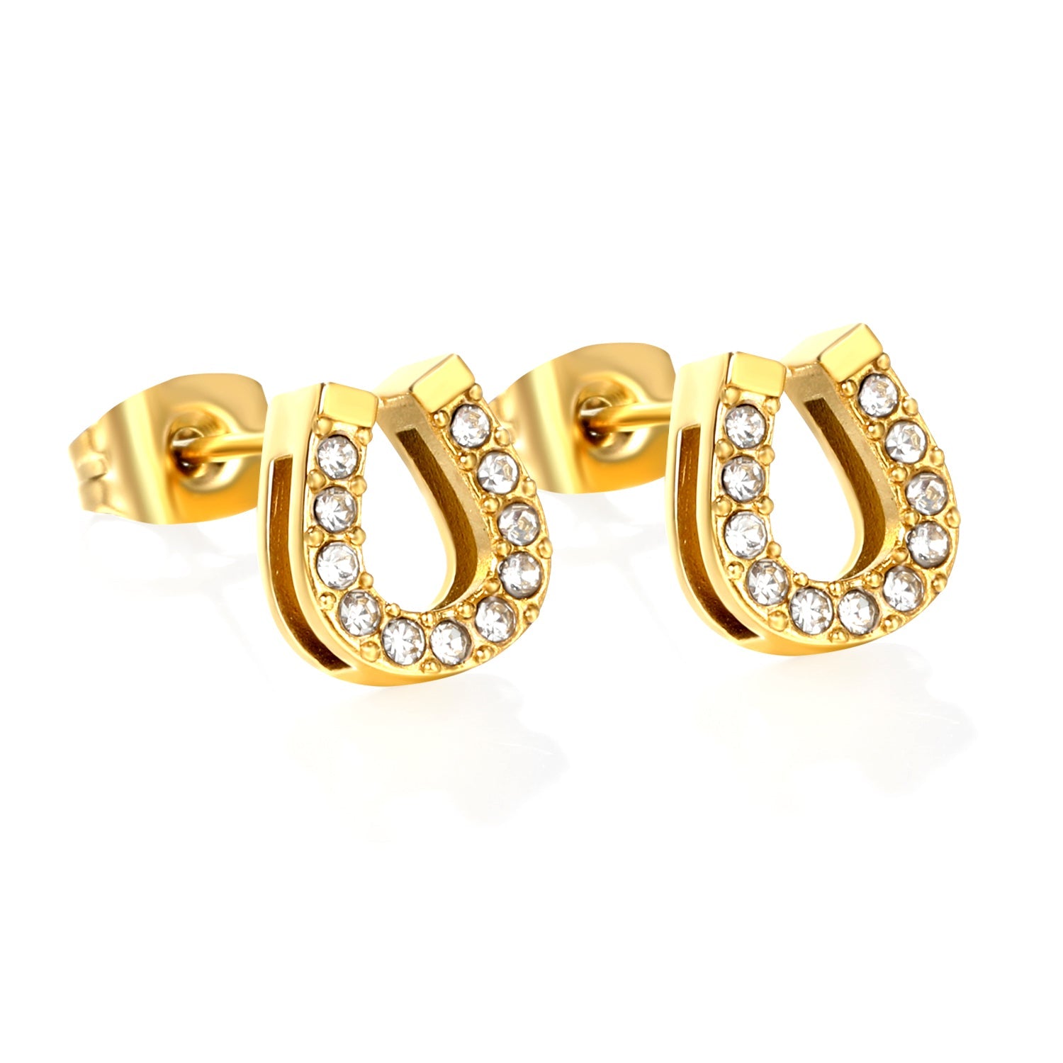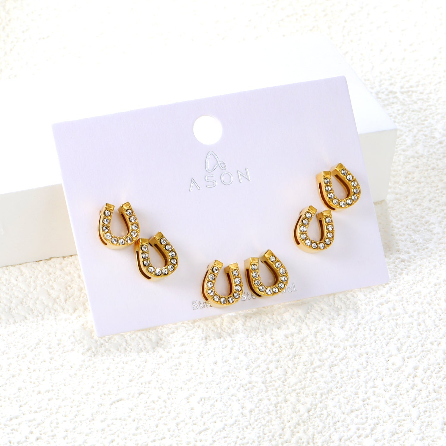 Premium collection featuring three pairs of 8*9.1mm U-shaped stud earrings adorned with brilliant white diamond-like stones in elegant gold settings. Each pair showcases the distinctive architectural U-shape design with precisely calibrated dimensions, creating a sophisticated geometric aesthetic. The meticulously set white stones provide exceptional sparkle and light reflection, while the gold finish adds warmth and luxury. This versatile trio offers excellent value with multiple styling options for diverse occasions.