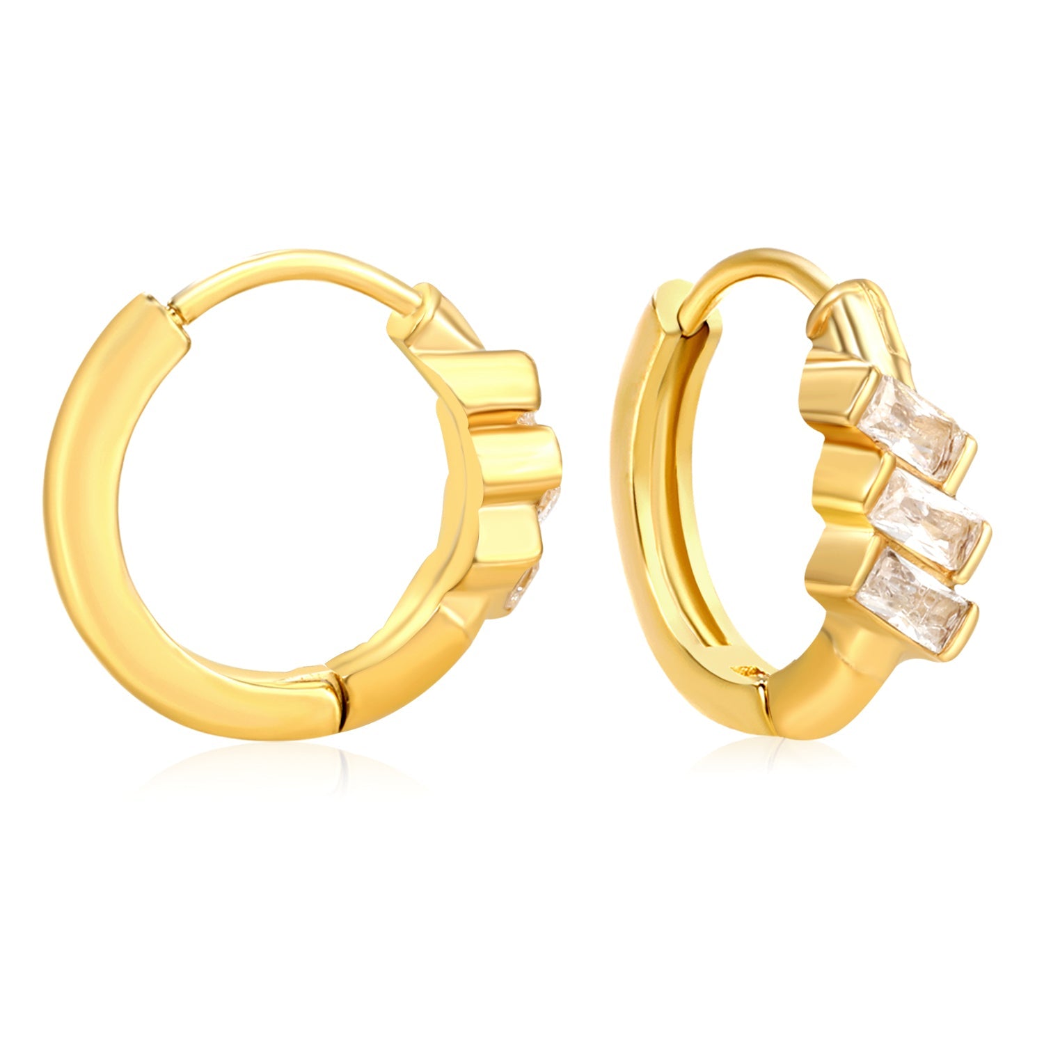 These gold-colored earrings feature three 4.2 x 8mm oblique square-shaped white zirconia stones, offering a modern and elegant design. The 2.2mm ear hooks with a 10mm inner diameter ensure a secure and comfortable fit, making them a sophisticated addition to any jewelry collection.