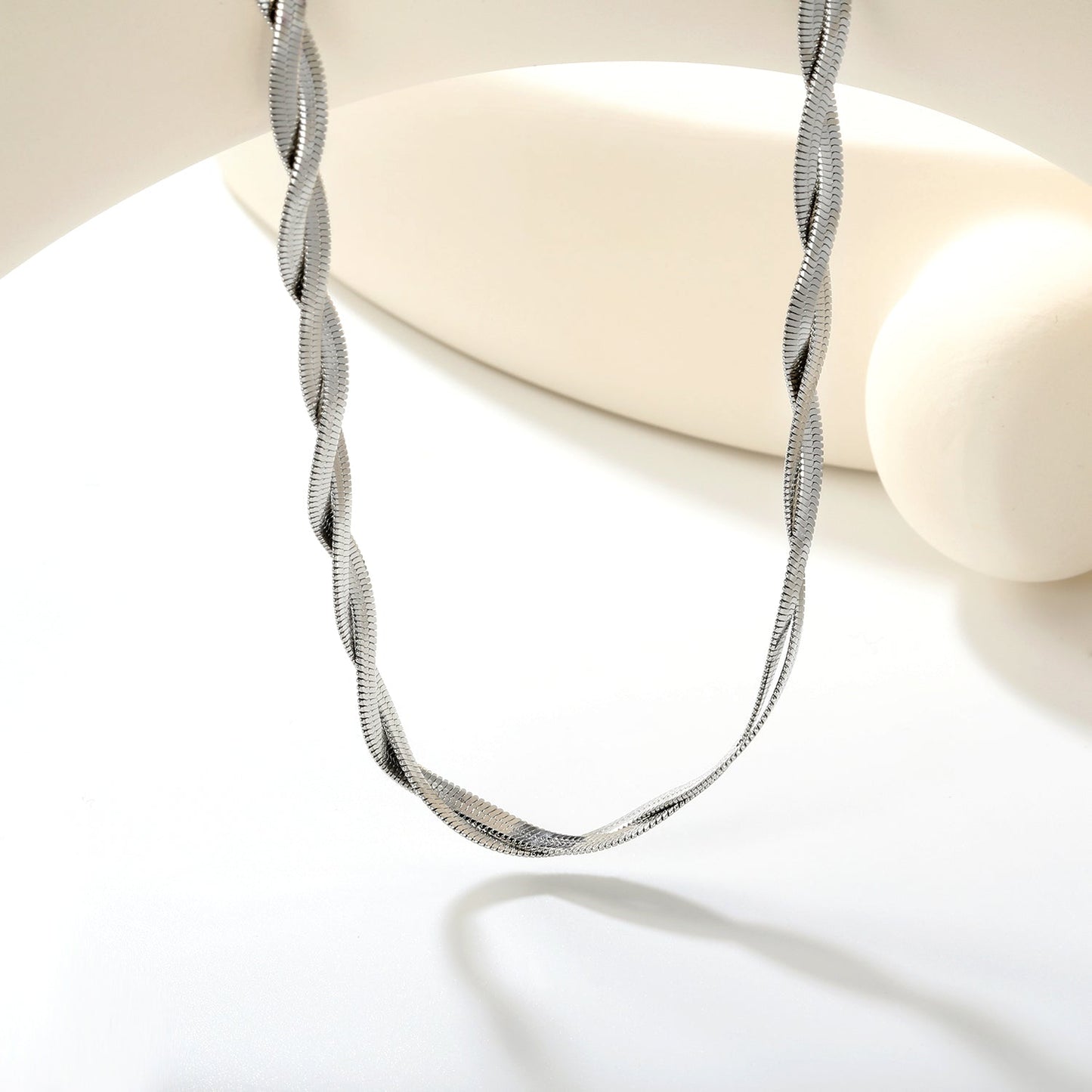 Meticulously designed 5.9mm crossed double strand necklace featuring an innovative interwoven pattern that creates dimensional texture. The 45cm length with 5cm extension offers versatile wearing options, while the dual-tone steel/golden finish provides exceptional styling flexibility. This architectural piece balances structural complexity with wearable elegance, transitioning seamlessly between professional and evening contexts.