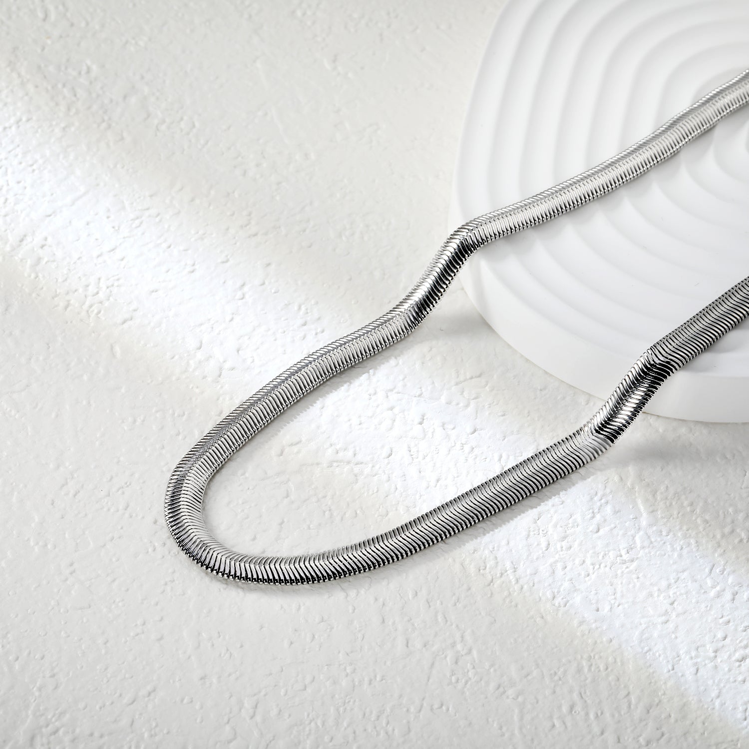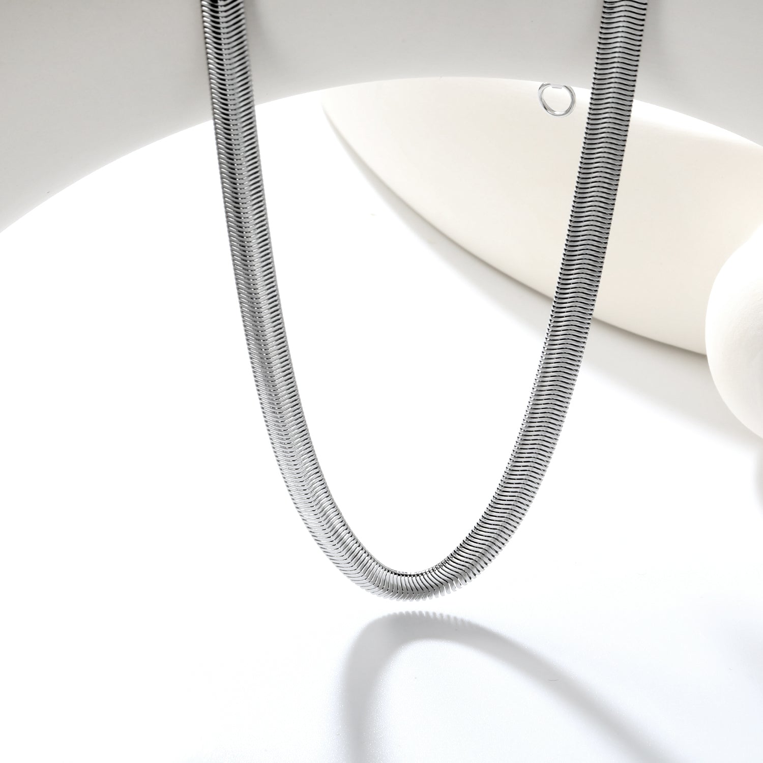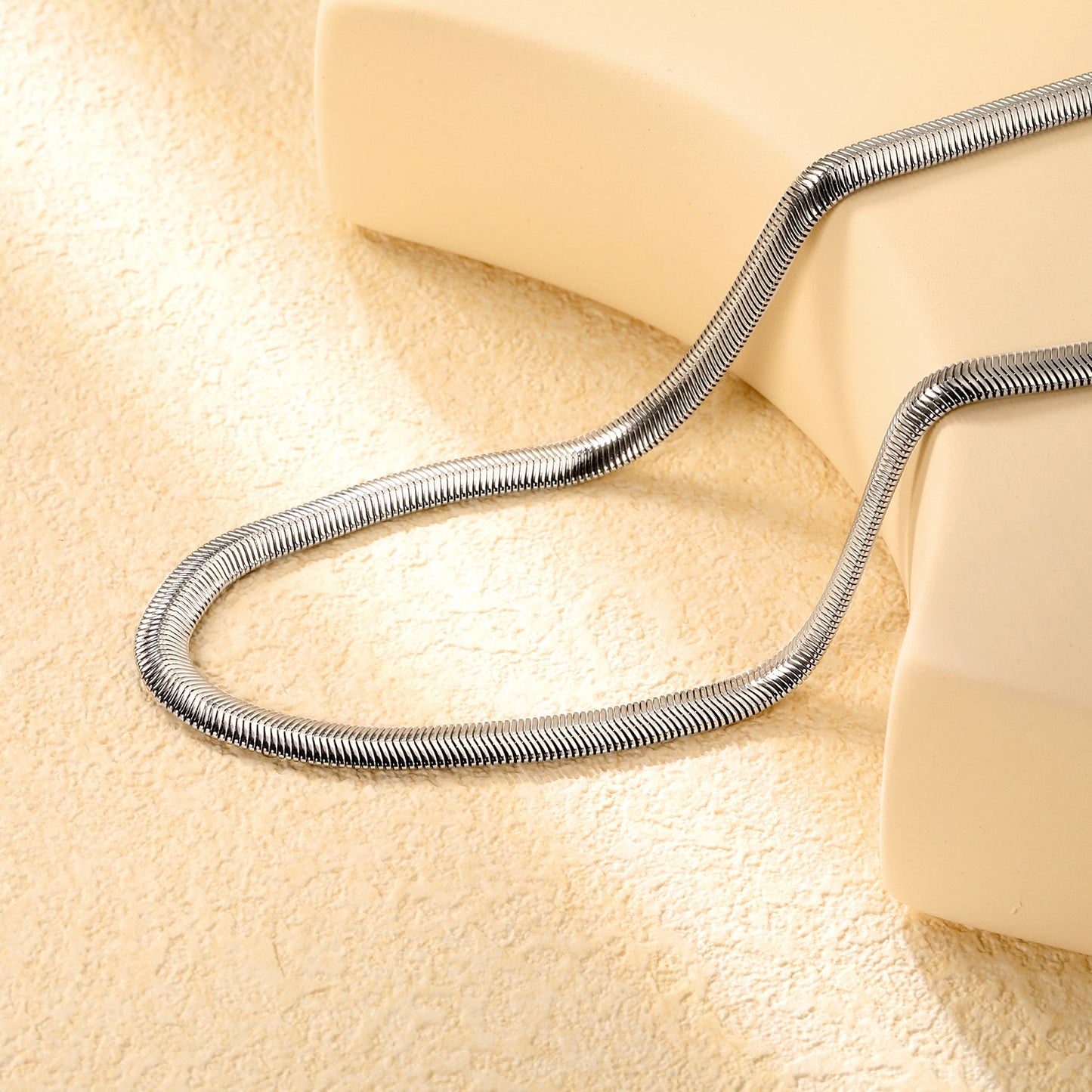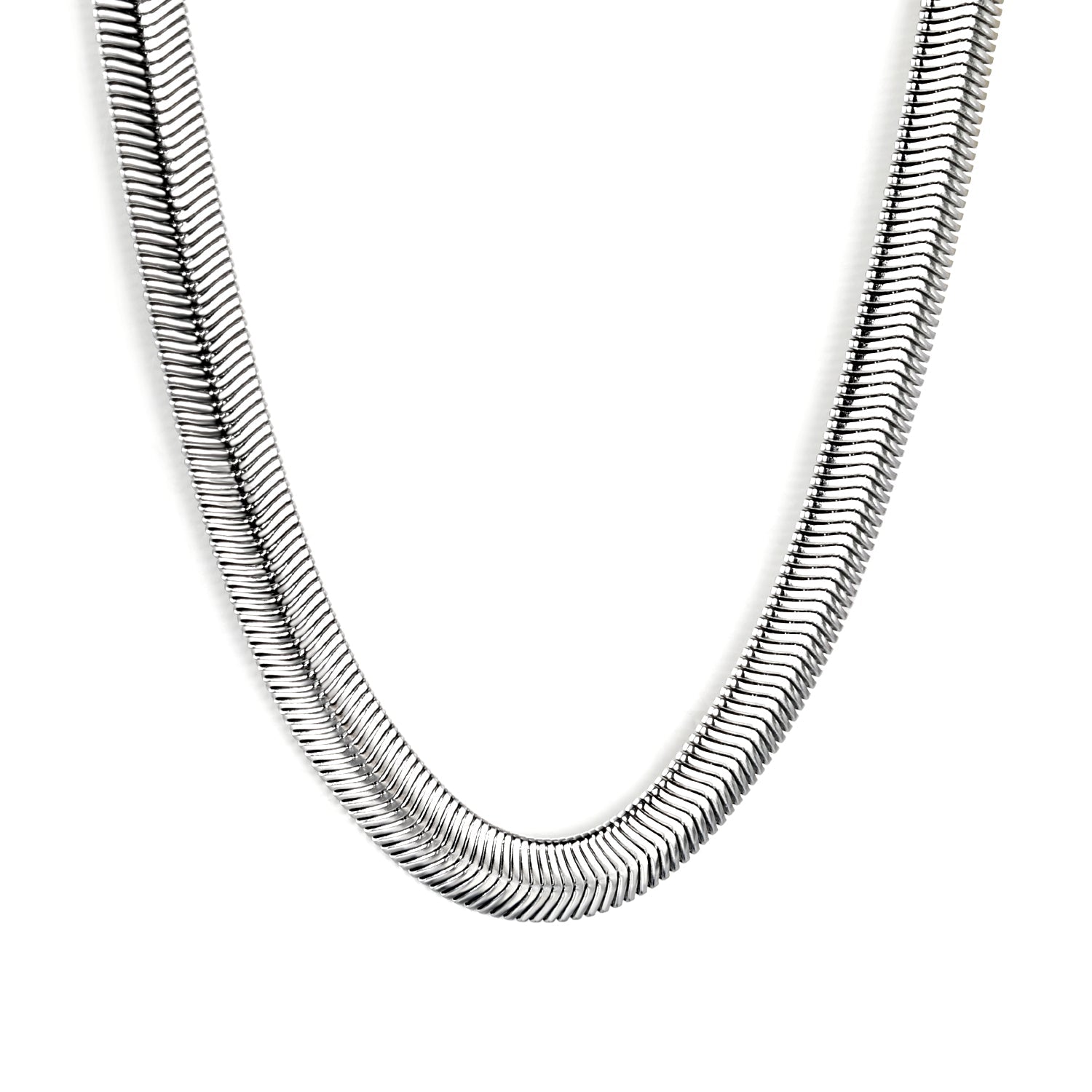 Precision-engineered 6mm flat snake chain crafted in sleek steel color with adjustable length from 45-60cm. The interlocking design creates a smooth, continuous surface that reflects light with subtle sophistication. This versatile chain offers exceptional durability while maintaining flexibility, making it suitable for pendants of various weights or as a standalone statement piece.