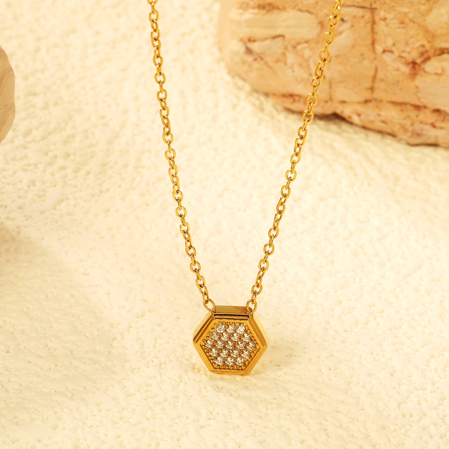 This precision-crafted 7.8*8.6mm Convex Hexagonal CNC White Zirconium Pendant boasts a 0.3 Cross Chain and 40+5cm+6mm Round Necklace in Golden color. Made with top-quality materials, this pendant offers superior durability and elegance. Upgrade any outfit with this stunning accessory.