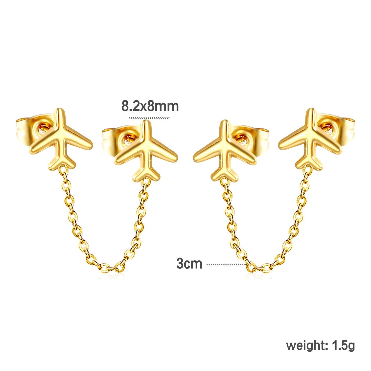 These stylish earrings feature a delicate cross chain and a whimsical airplane charm, both crafted with precision and care. Measuring 8.2*8mm and paired with a 30mm chain, they are the perfect accessory to add a touch of elegance and playfulness to any outfit. Made with a golden finish, these earrings are sure to make a statement.