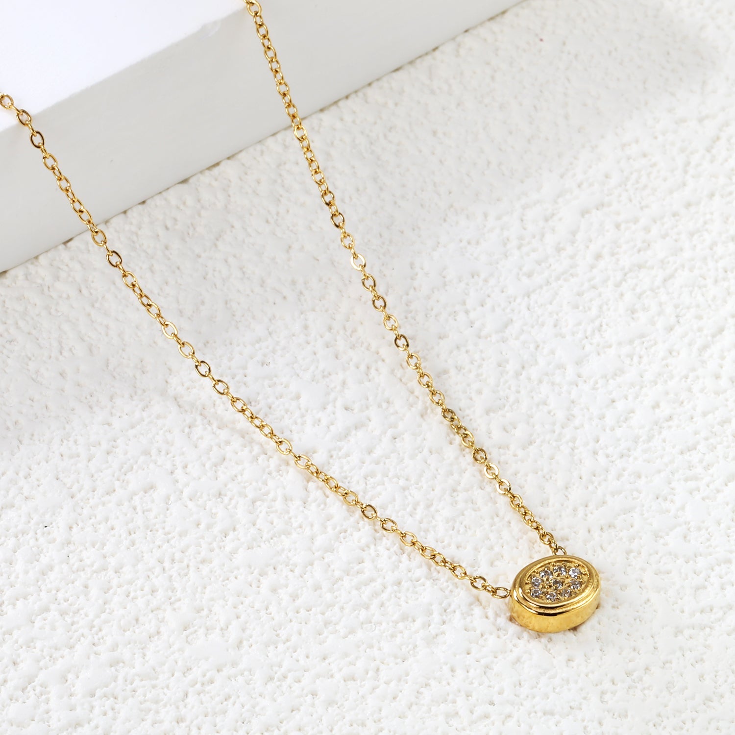 This 8.6*6.8mm convex oval pendant features a CNC zirconia stone, adding elegance and shine to any outfit. The 0.3 cross chain and 40+5cm+6mm round necklace are included, adorned in a luxurious gold color. Perfect for adding a touch of sophistication to your look.
