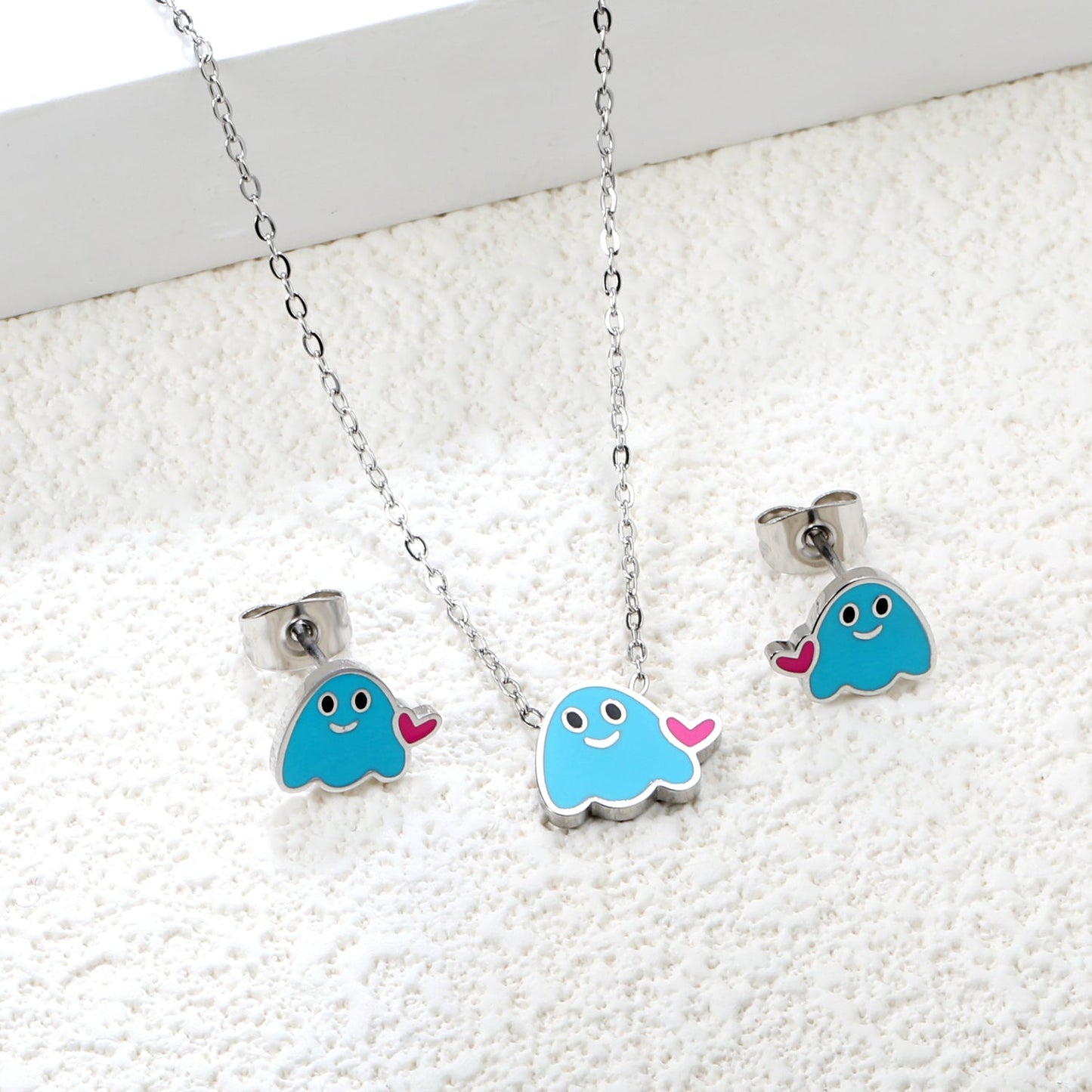 Drip oil heart brat set steel color / gold color Earrings: 9.6*8mm Pendant: 11.6*9.4mm 0.3 cross chain 40+5cm+6mm round plate