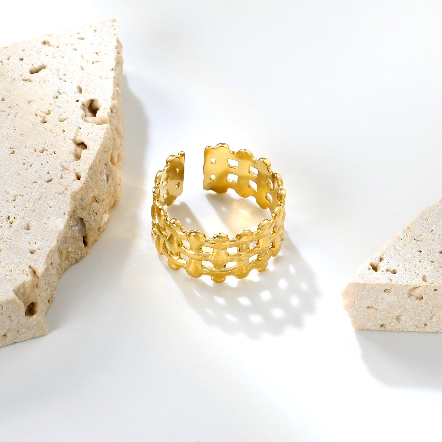 Durable stainless steel open ring featuring a distinctive chain link design with elegant gold-tone finish. The dimensional elements provide visual and tactile interest while hypoallergenic properties ensure comfortable extended wear. Adjustable sizing accommodates various finger dimensions.