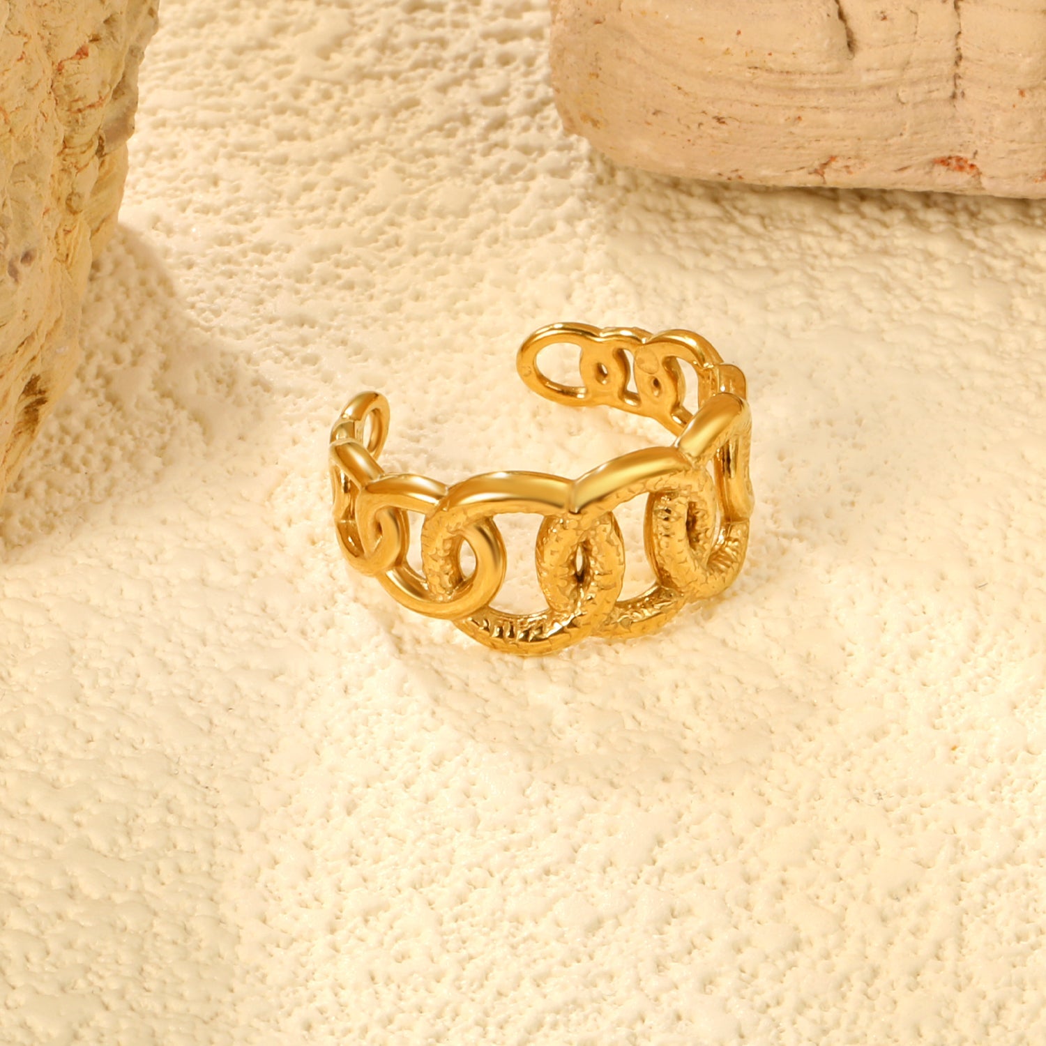 This premium stainless steel open ring showcases an exquisite golden spiral link design that creates a sophisticated layered effect. The precision-engineered spiral configuration provides dimensional interest while maintaining structural integrity. The meticulous gold-tone finish enhances the architectural elements with warm luminosity, contrasting elegantly against the durable stainless steel substrate. The adjustable open band ensures versatile sizing, making this refined piece suitable for diverse styling applications where contemporary elegance meets technical craftsmanship.