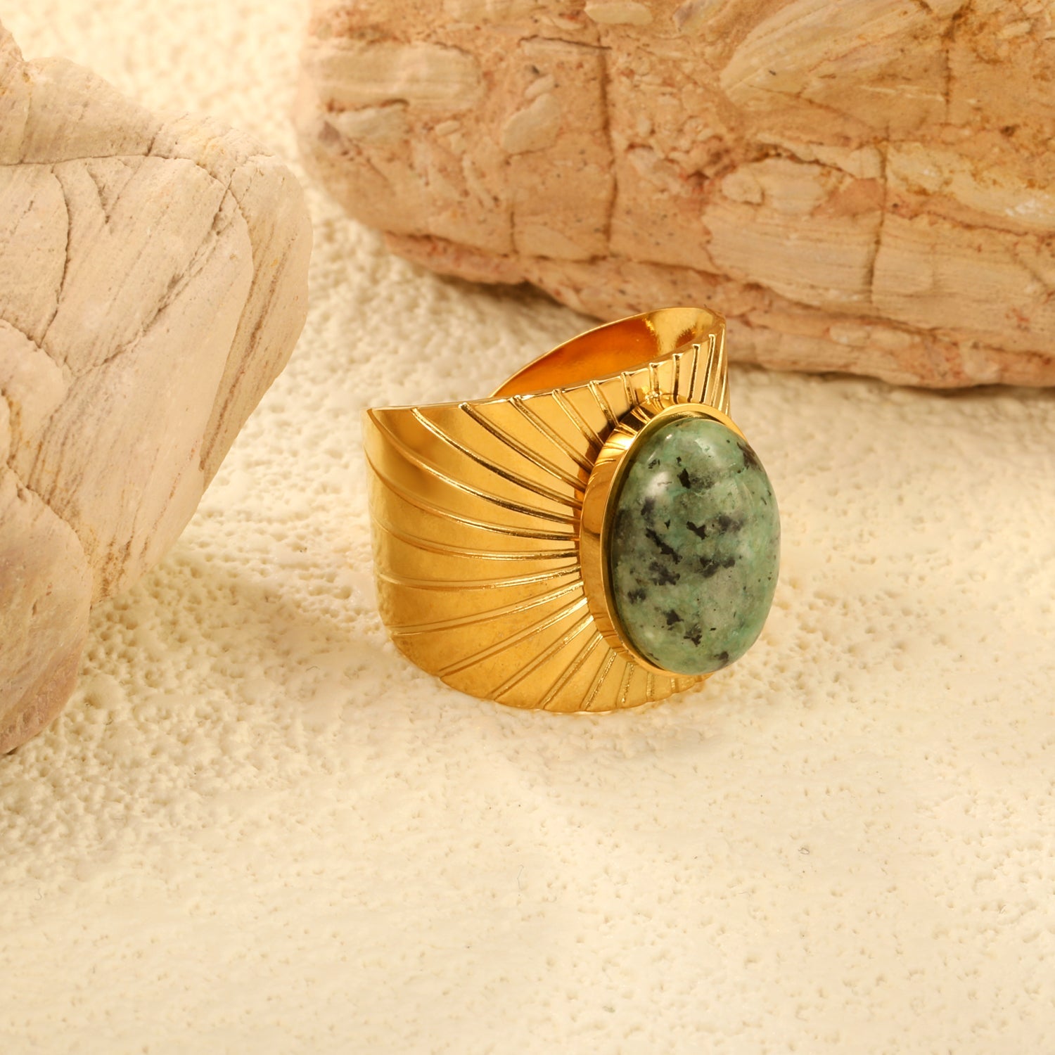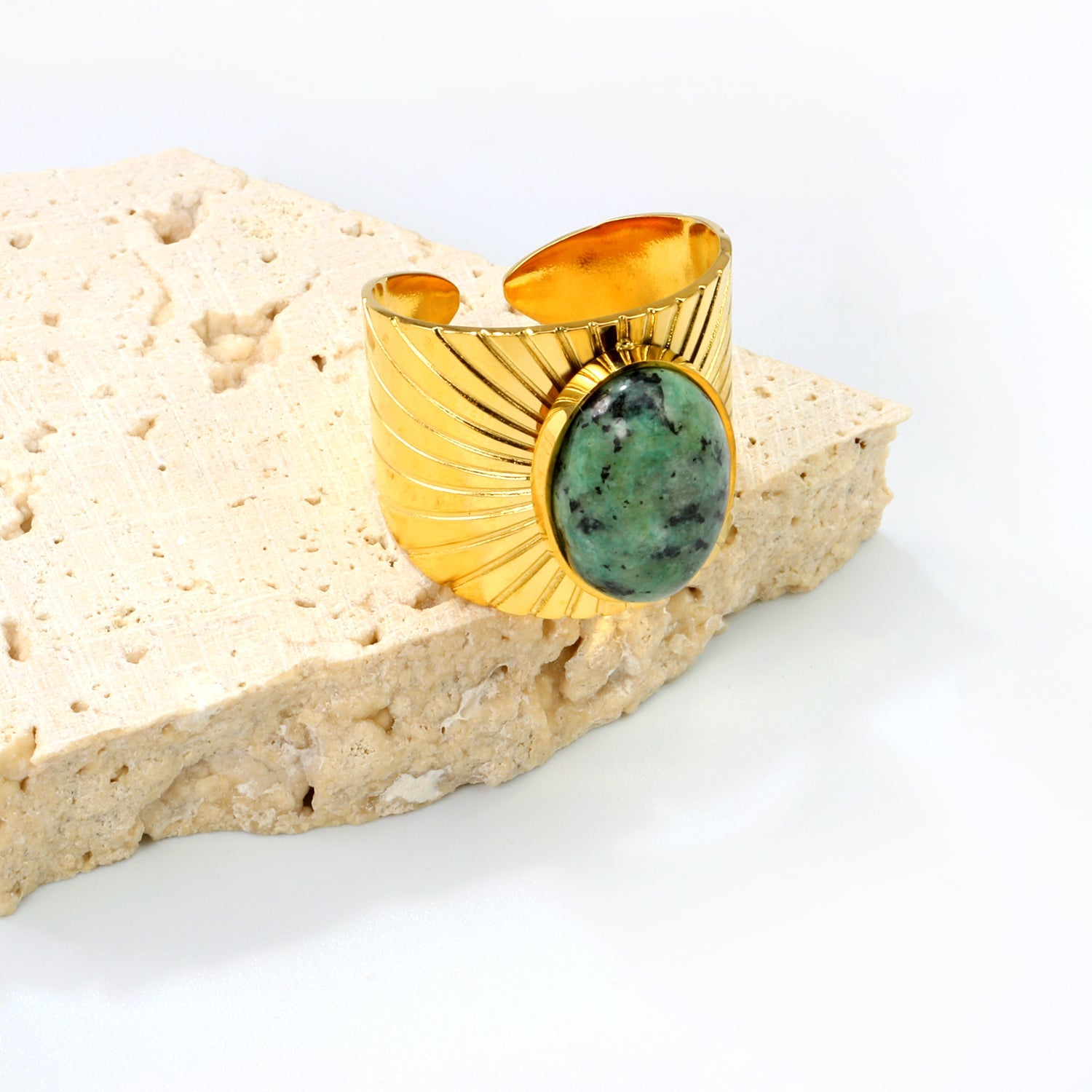 This 18.8mm Chrysoprase Split Ring is expertly crafted with a 16mm open-end design and adorned with three turquoise stones, set in a luxurious gold color. Elevate any outfit with the unique beauty and timeless elegance of this stunning accessory.