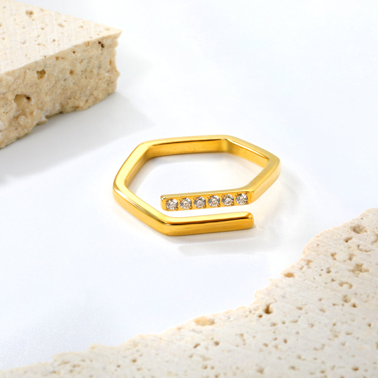 This hexagonal ring features a stunning white zirconia head that is meticulously CNC set, ensuring precision and quality. The height of 5.7 mm gives a subtle yet noticeable appearance. Available in a sleek steel color with gold accents, this ring exudes elegance and style.