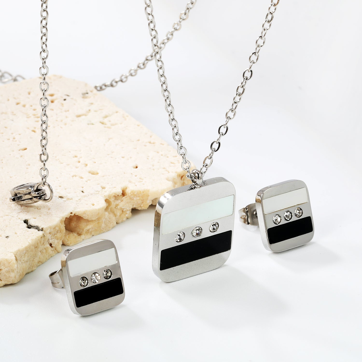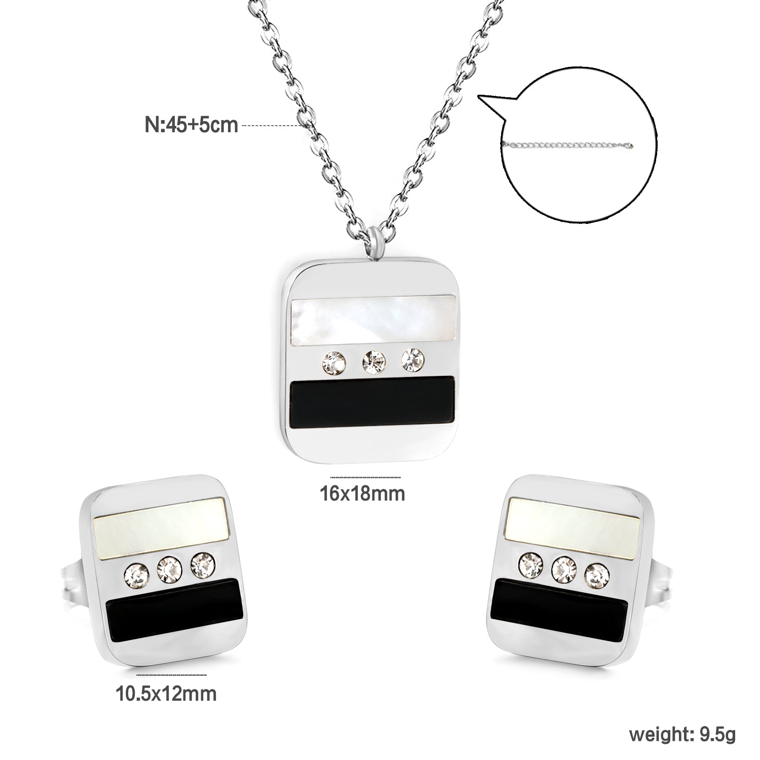 Rectangle Sticky Black and White Shells + White Diamonds Set Steel Color / Gold Earrings: 10.5*12mm Pendant: 16*18mm 04 Cross 45+5cm+6mm Round Plaque