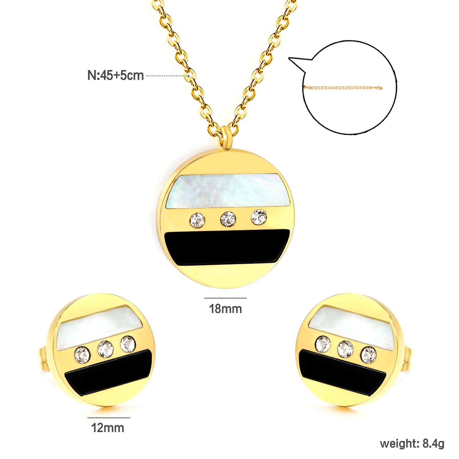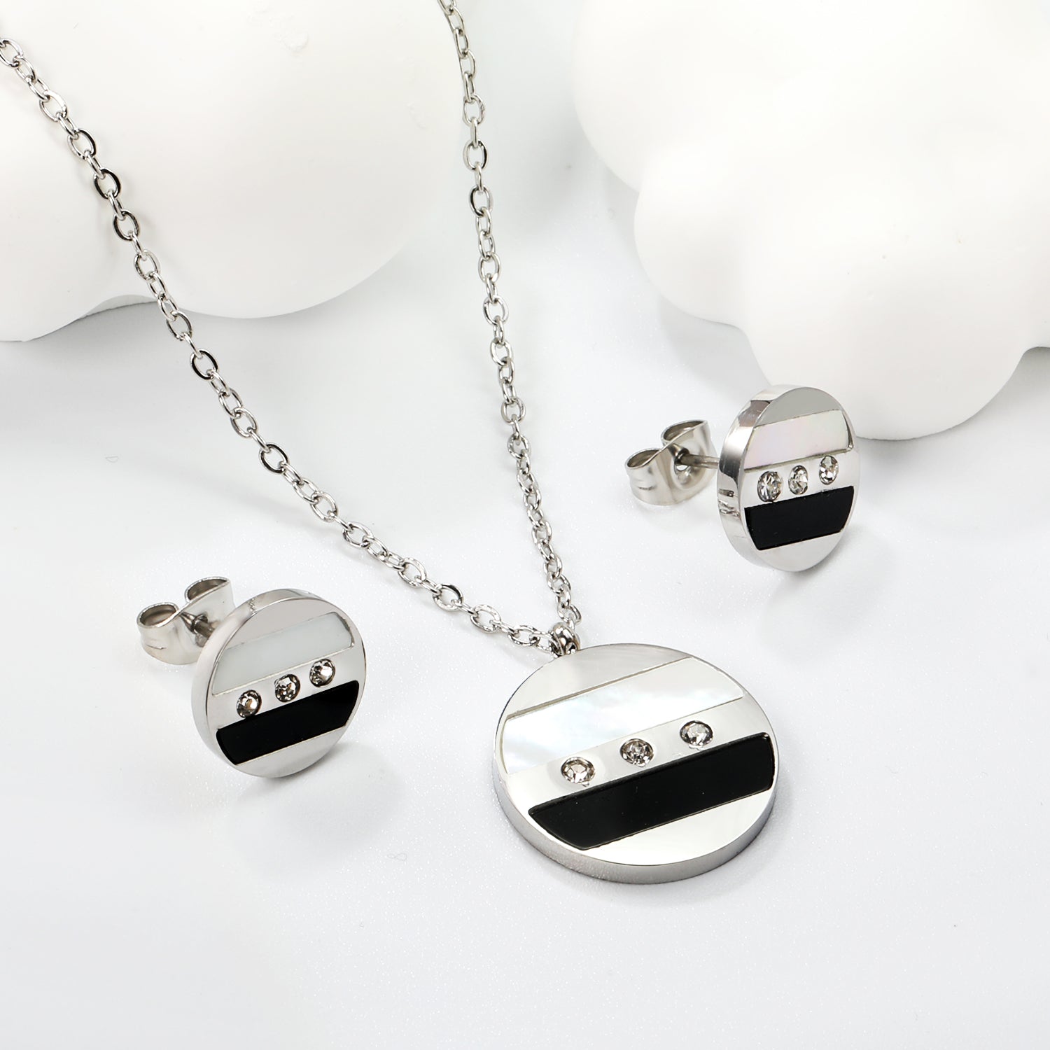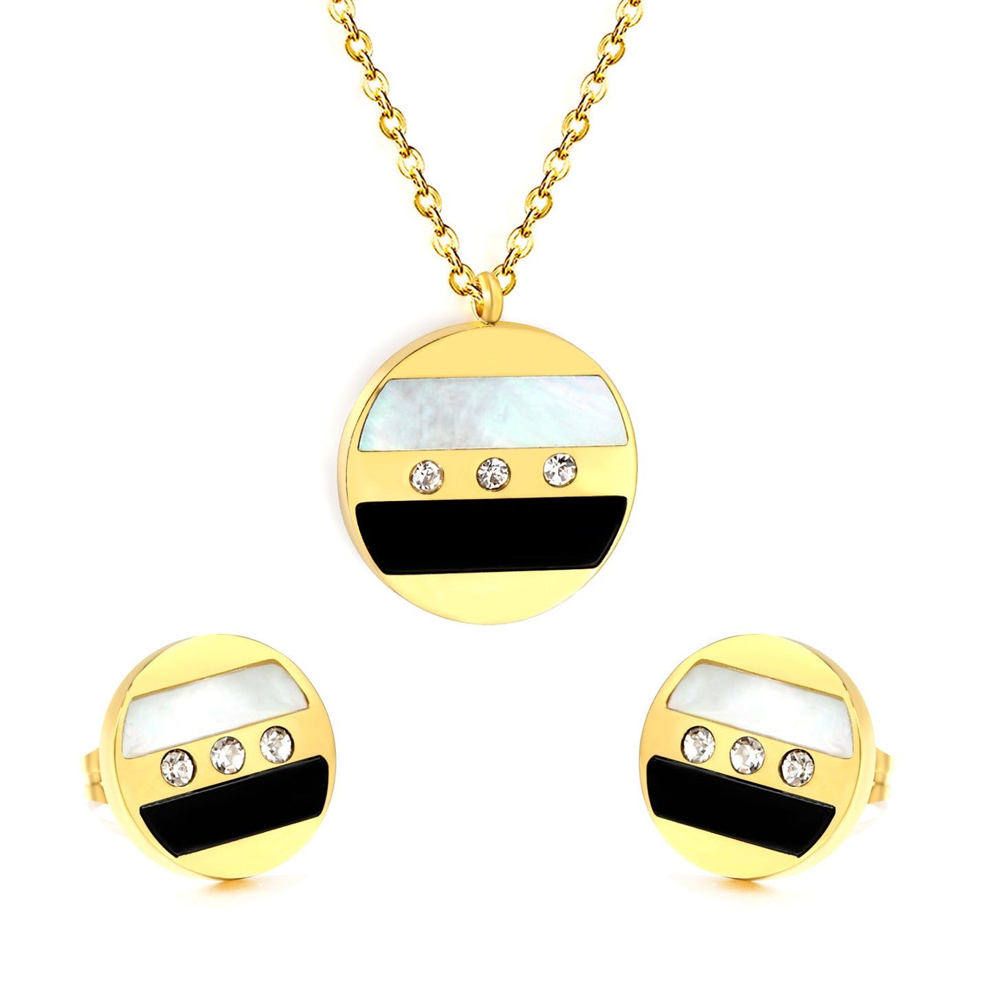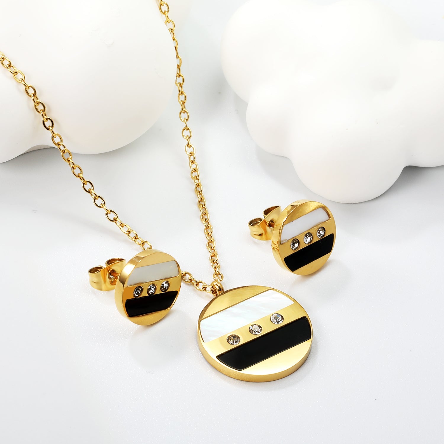 Round Sticky Black and White Shells + White Diamonds Set Steel Color / Gold Earrings: 12mm Pendant: 18mm 04 Cross 45+5cm+6mm Round Plaque
