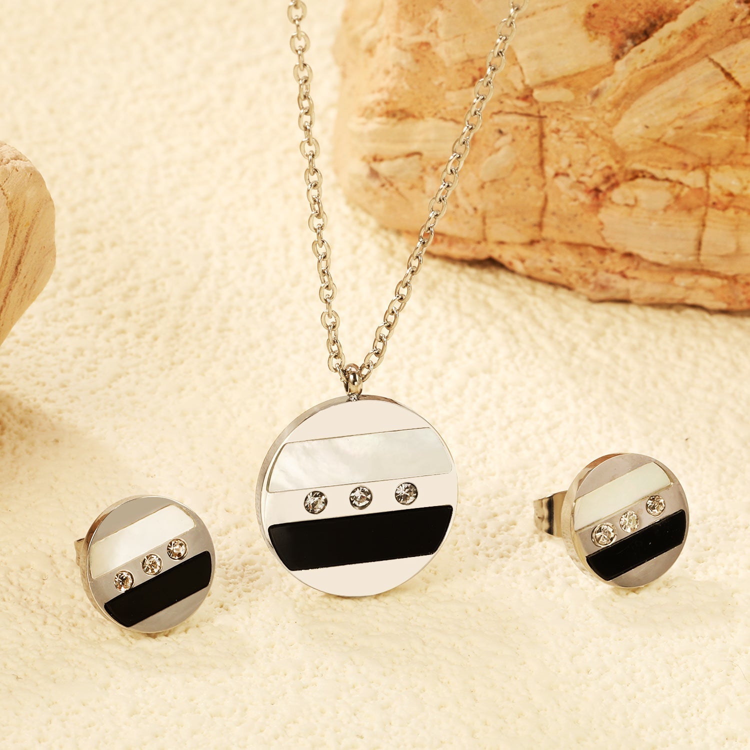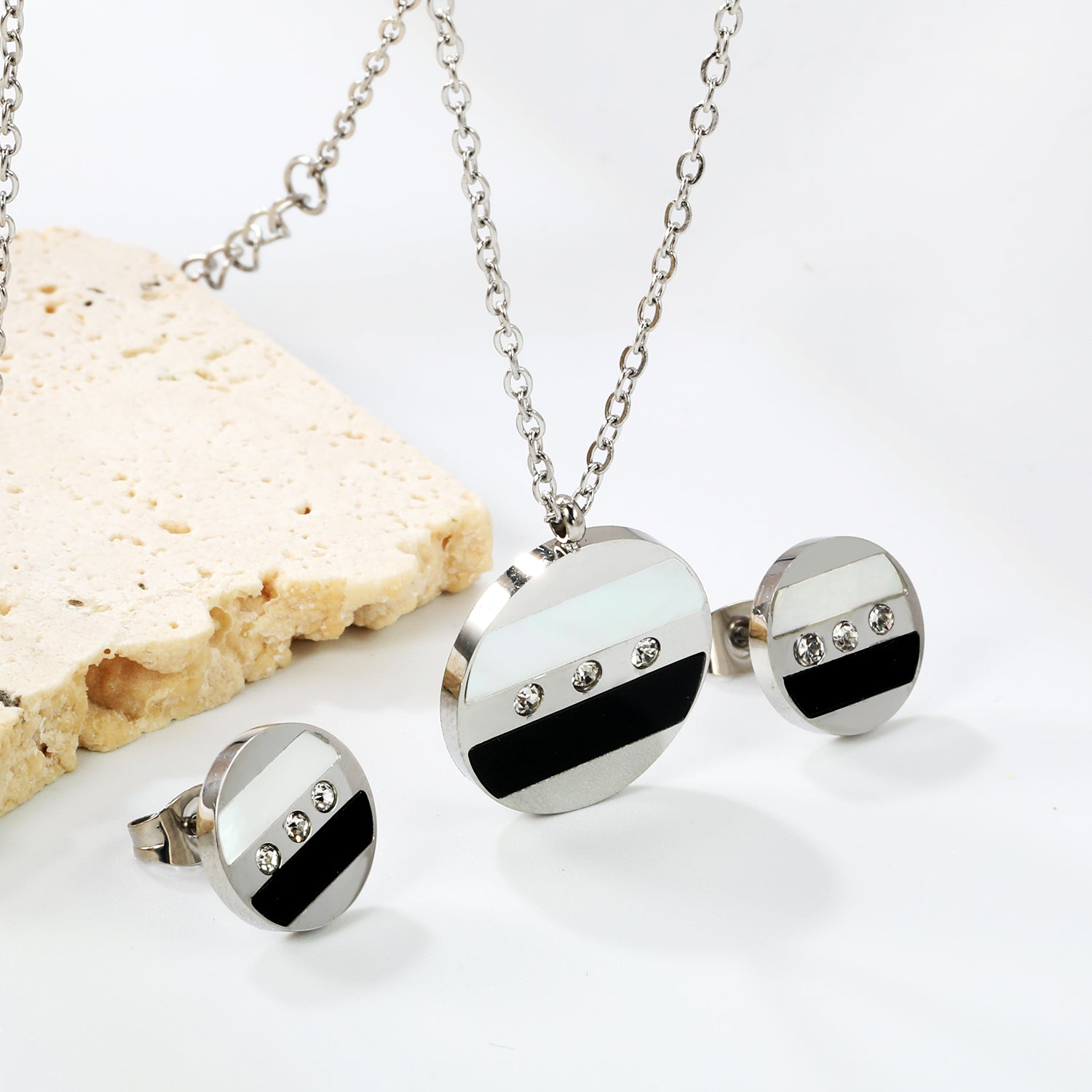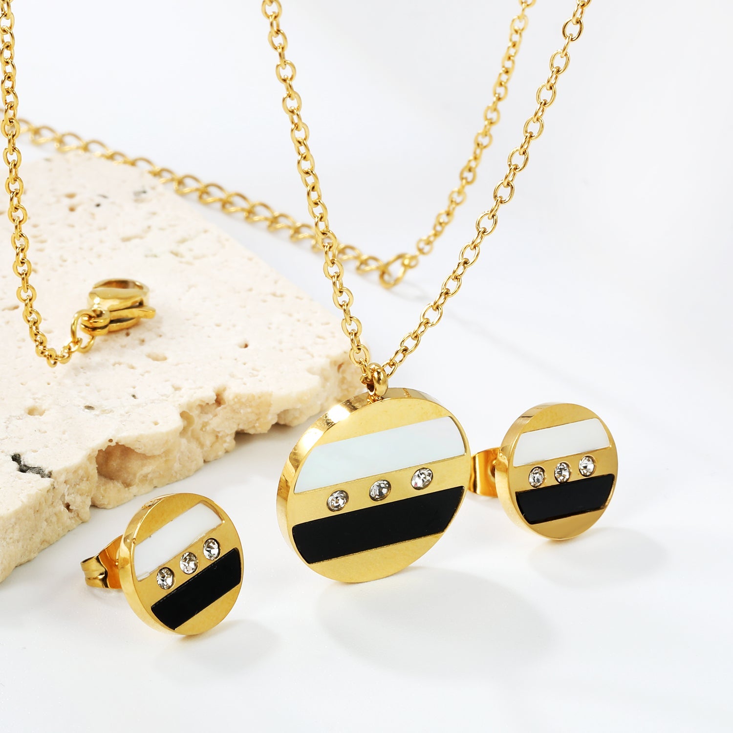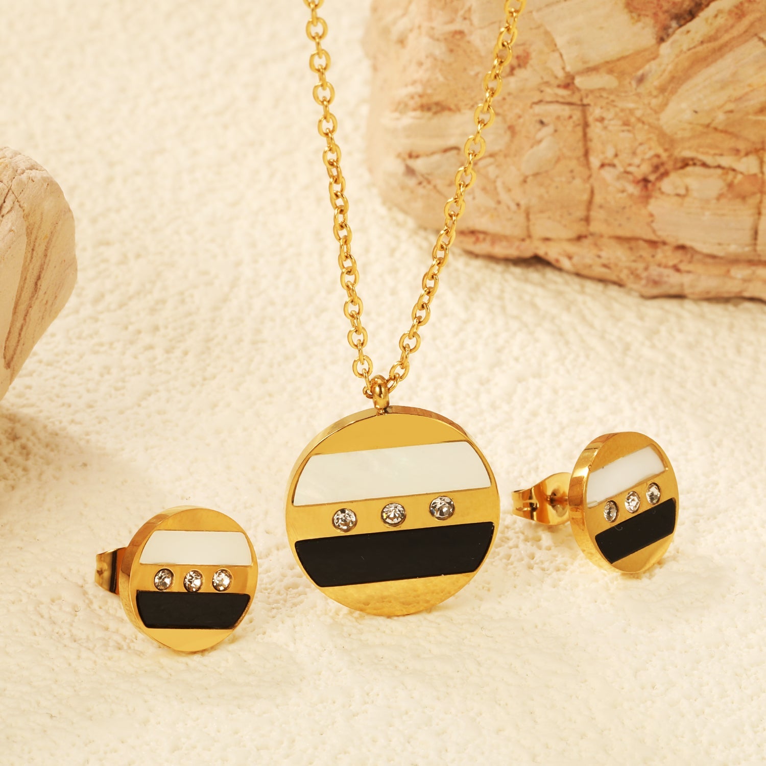 Round Sticky Black and White Shells + White Diamonds Set Steel Color / Gold Earrings: 12mm Pendant: 18mm 04 Cross 45+5cm+6mm Round Plaque