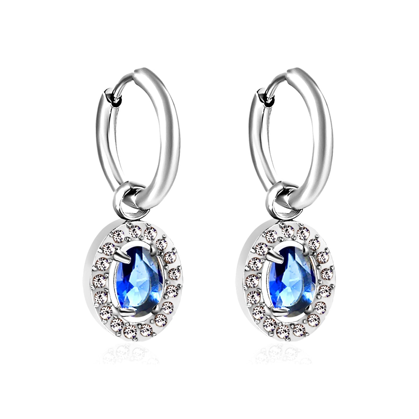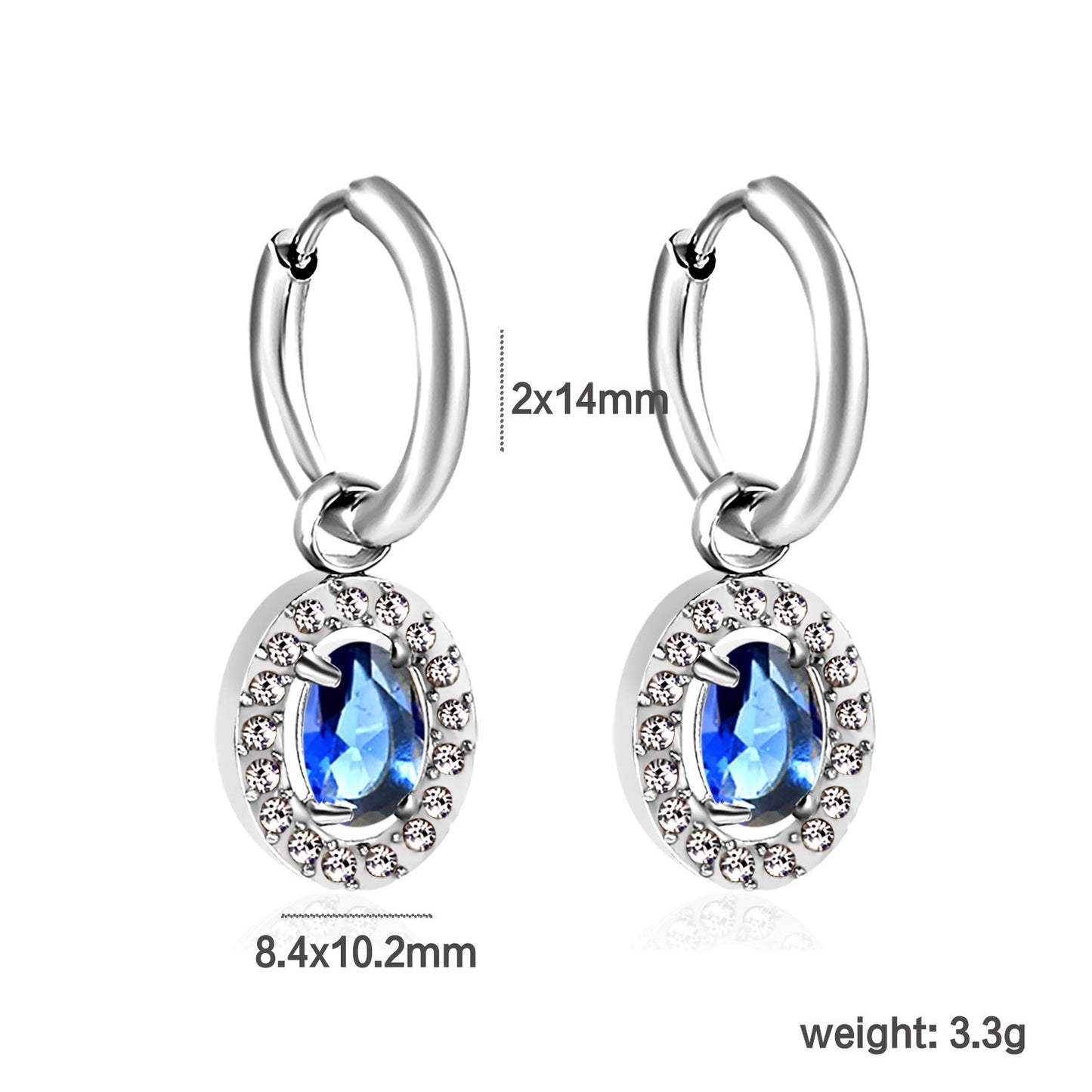Wire 2*14mm O.D. earrings + 8.4*10.2mm oval blue glass + CNC drilling white zirconium hoop fittings earrings steel color