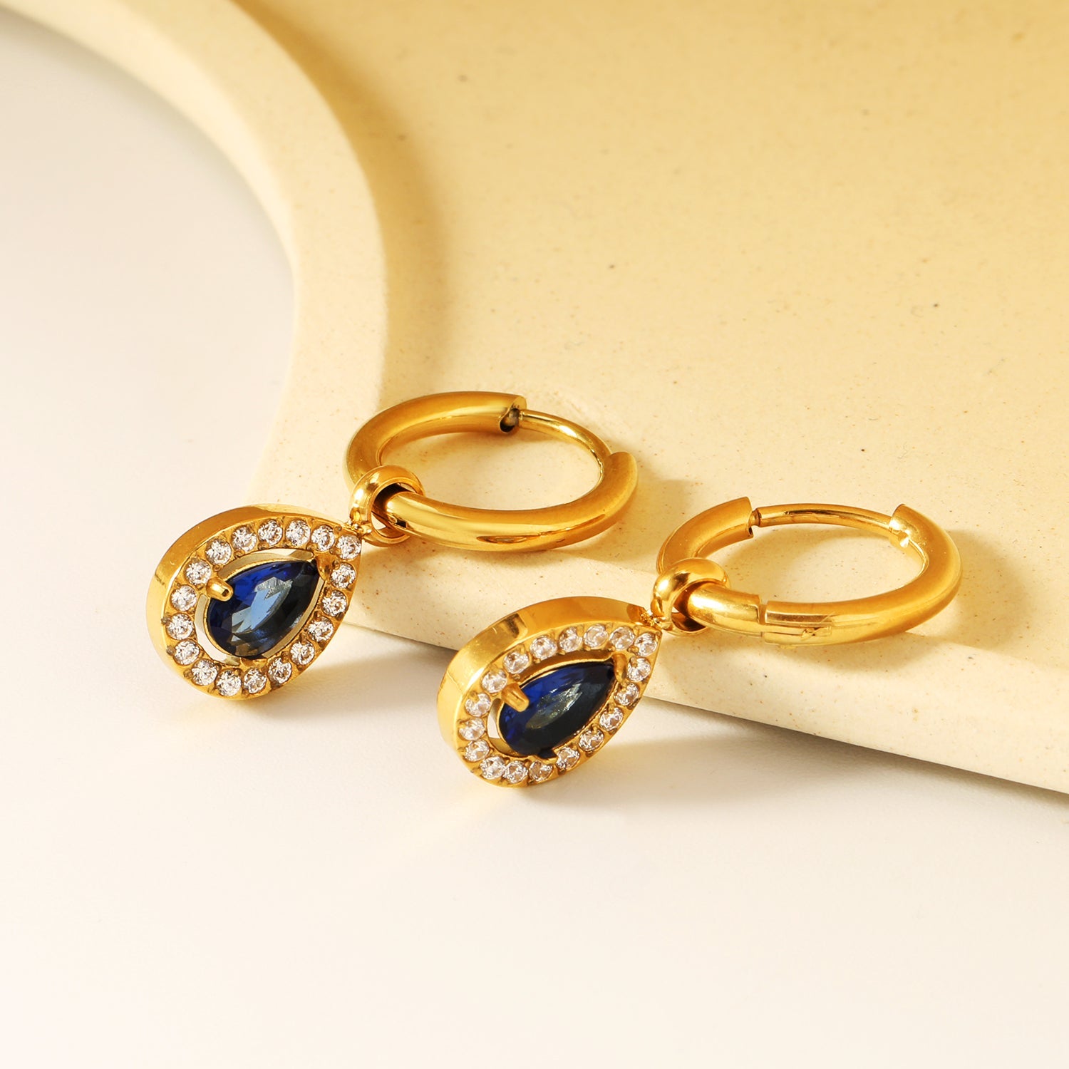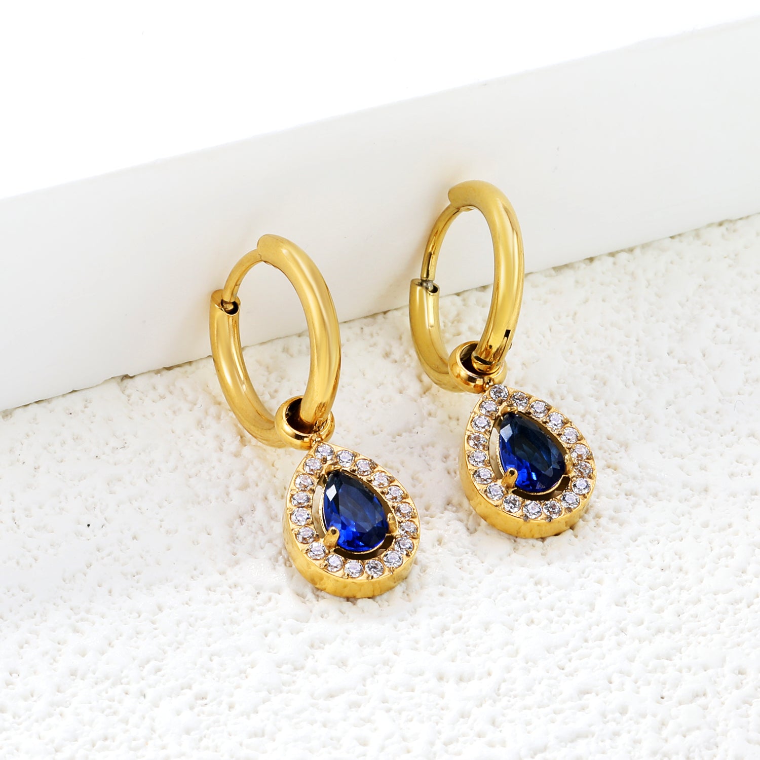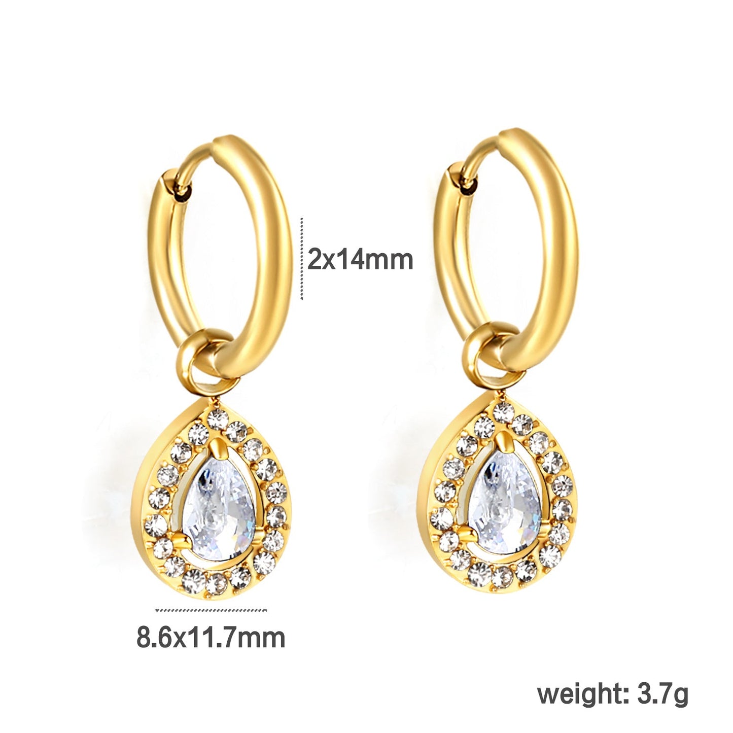 Wire 2*O.D. 14mm earrings + 8.6*10.8mm drop-shaped white zirconia/emerald green glass + CNC drilling white zirconium hoop fittings Gold color